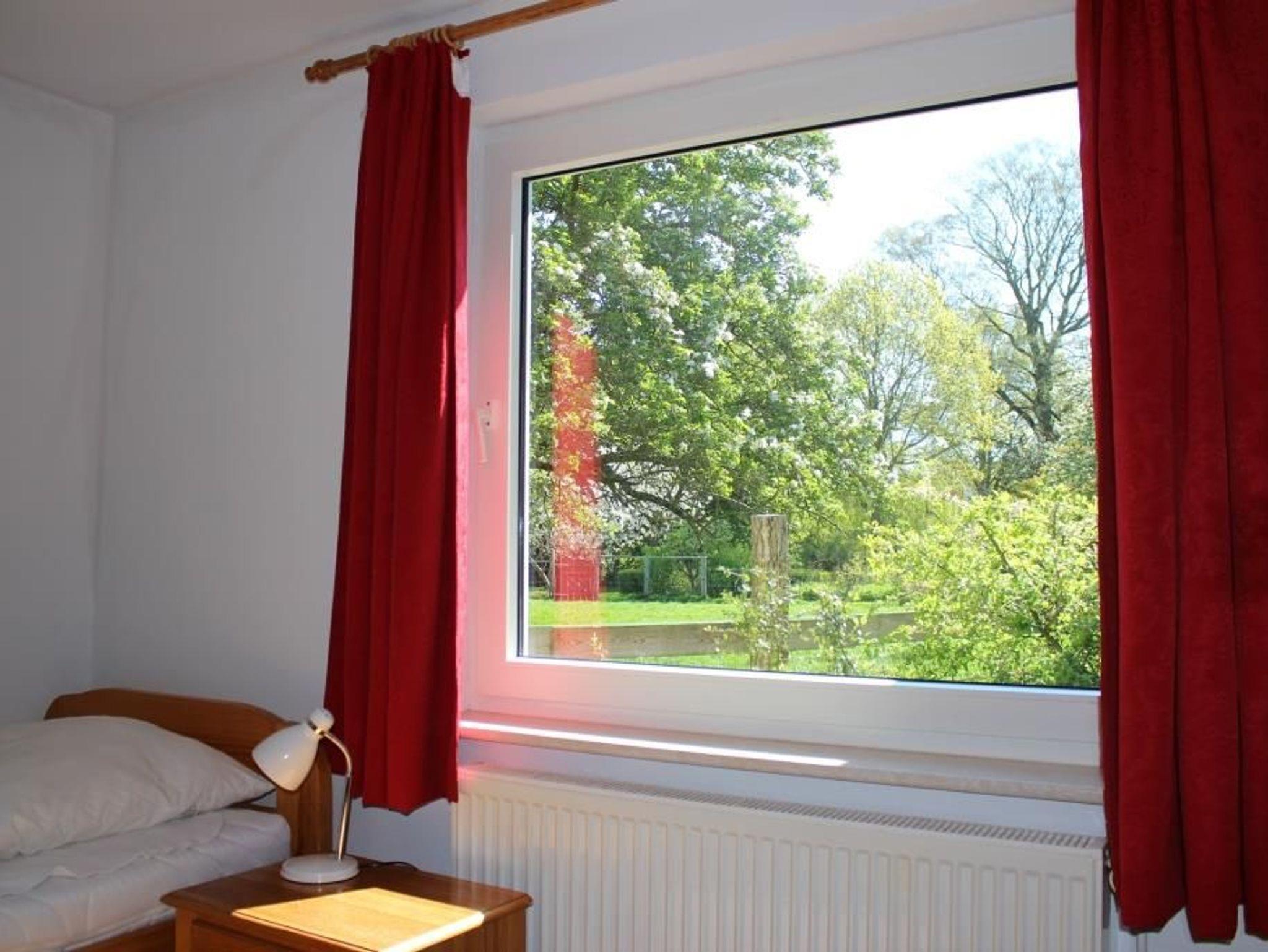 Das Backhaus verfügt über ein Eltern- und ein Kinderschlafzimmer, ein Wohnzimmer mit Essbereich, eine kleine Küche mit Spülmaschine und ein Duschbad mit WC. Die beiden Schlafzimmer sind separat vom Wohnzimmer aus zu erreichen. Direkt vor dem Eingangsbereich befindet sich ein überdachter Vorbau, wo Sie bequem und trocken Ihre Fahrräder oder auch einen Kinderwagen abstellen können. Zur Südseite gelegen lädt eine gemütliche Gartensitzgruppe zum Frühstücken oder geselligen Beisammensein am Abend ein.