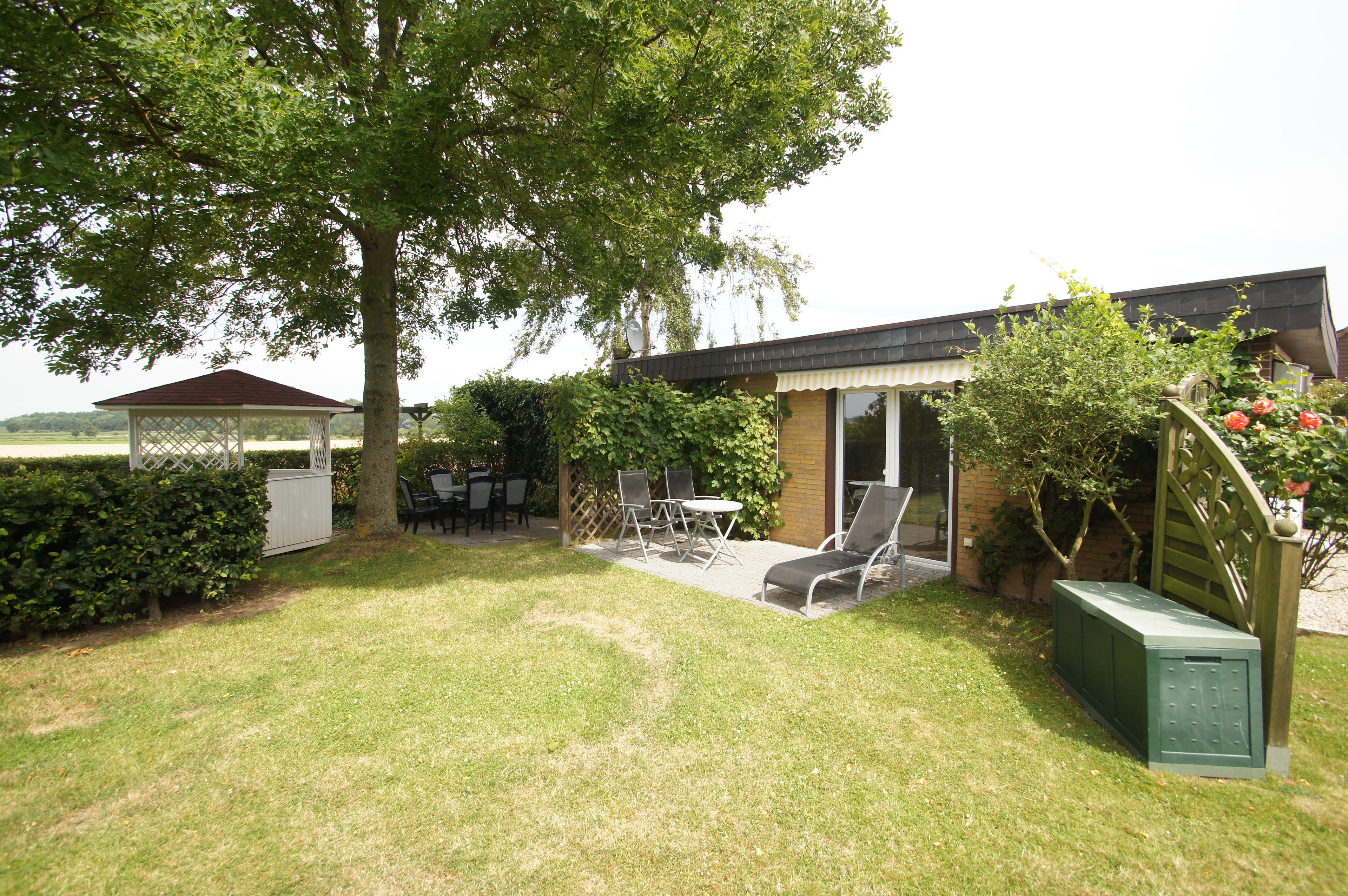 Gemütlicher Bungalow in Dahme mit Terrasse und Blick auf Wiesen und Felder, ideal für naturnahe Erholung.