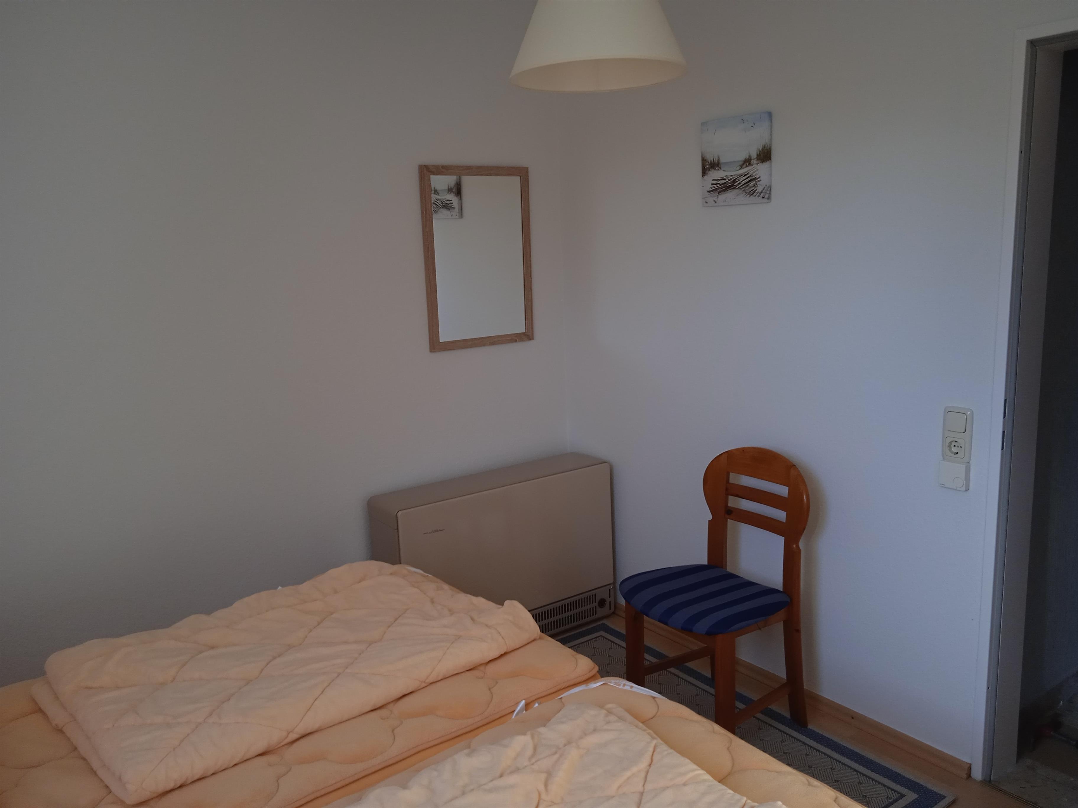 Es verfügt über 2 separate Schlafzimmer (ca. 14m² und ca. 12m²) in der 1. Etage, die Ende 2022 renoviert wurden. In dem größeren Schlafzimmer befindet sich das Doppelbett (1,80m x 2m), in dem Kleineren sind 2 Einzelbetten (2m lang). Es stehen synthetische Bettdecken und Kopfkissen zur Verfügung.