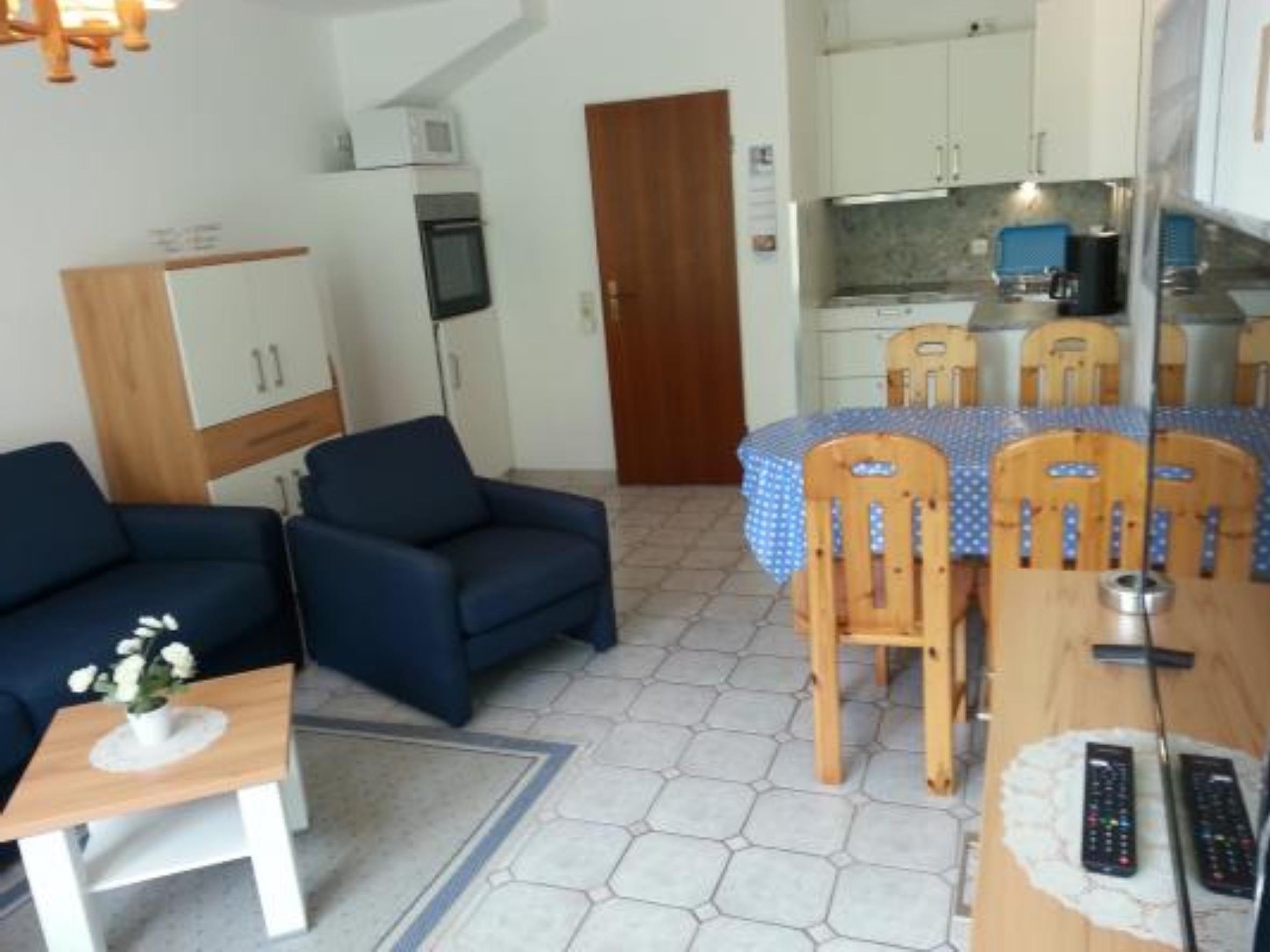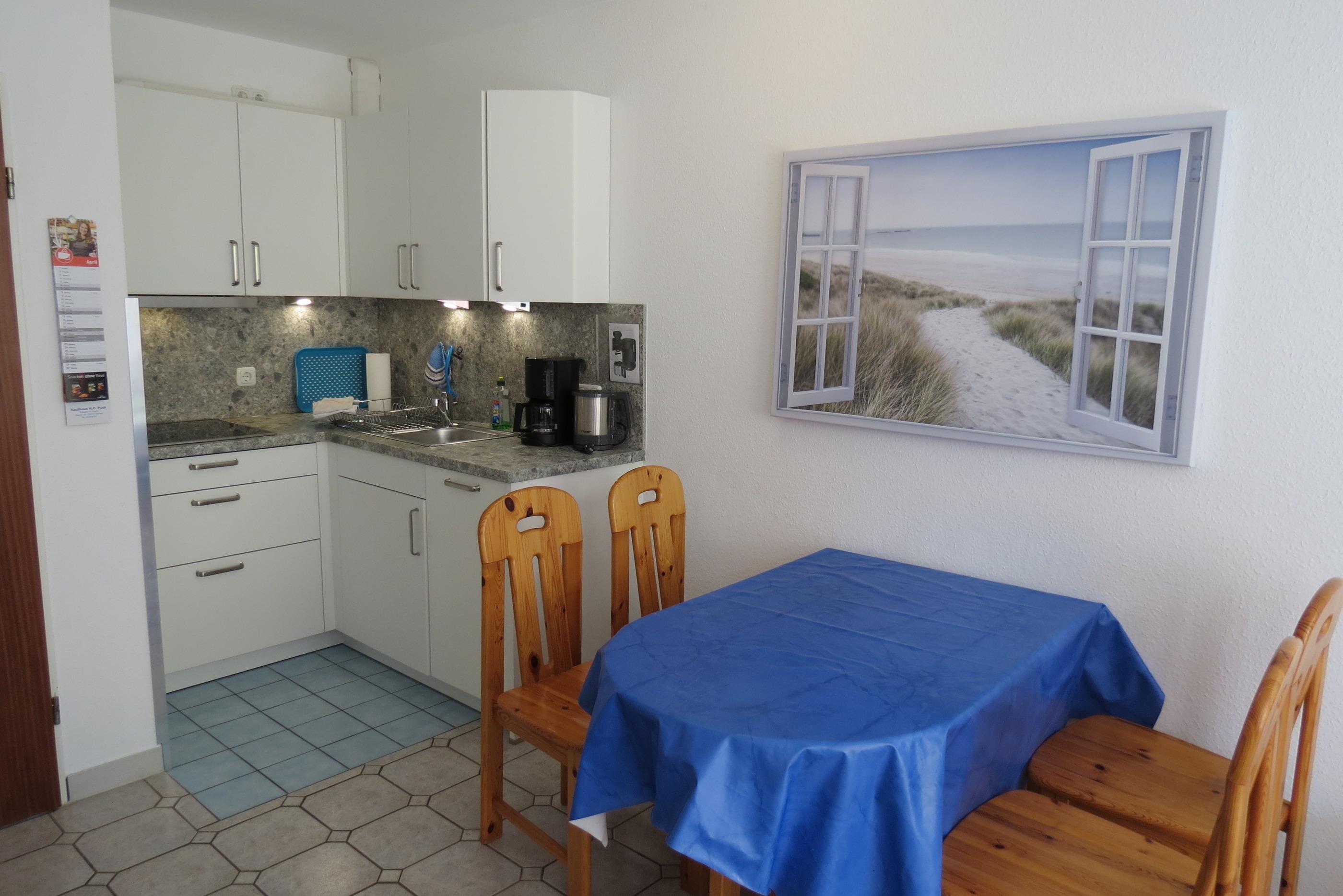 Im EG befinden sich das in 2021 renovierte Duschbad mit Fenster und das in 2020 renovierte Wohnzimmer (ca. 25m²) mit eigener, eingezäunter Terrasse (Zaunhöhe ca. 1m). Es ist eingerichtet mit 1 Sofa mit Schlaffunktion (für 2 Personen - 1,60m x 2m), 2 Sesseln, SAT-TV, Esstisch mit Stühlen und offen zur ebenfalls in 2020 renovierten Küche mit Dunstabzugshaube, Backofen, Geschirrspülmaschine, Mikrowelle, Cerankochfeld, Kühlschrank mit Gefrierfach, Kaffeemaschine, Wasserkocher, Toaster, Mixer, Eierkocher und Geschirr.