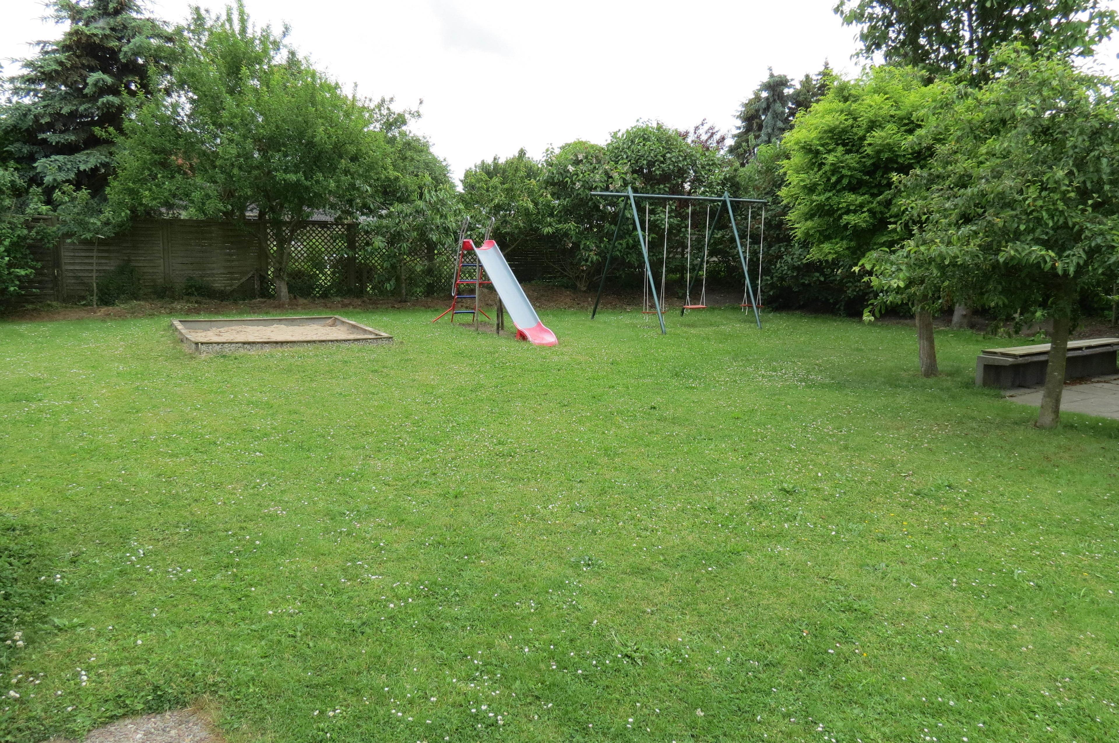 Unsere Außenanlagen nebenan, die bequem über den eigenen Garten zu erreichen sind, laden zum Verweilen ein und bieten Ihren Kindern einen Spielplatz (Sandkiste, Rutsche, Schaukeln und große Rasenfläche) und Ihnen einen Grillplatz mit Grillkamin (wir bitten unsere Gäste um Reinigung nach der Benutzung). Ein Fahrradabstellplatz und eine große Wäscheleine sind ebenfalls vorhanden.
