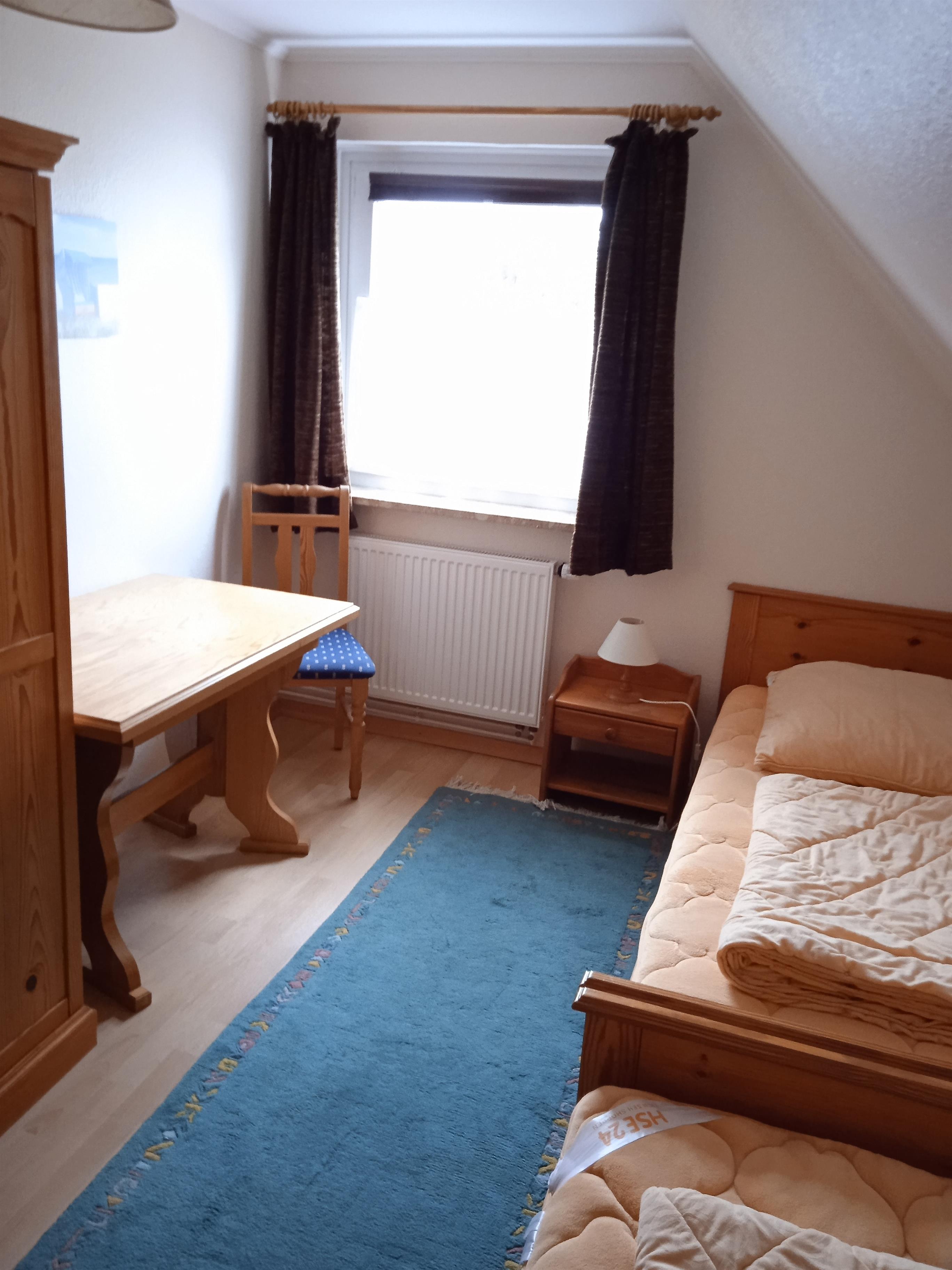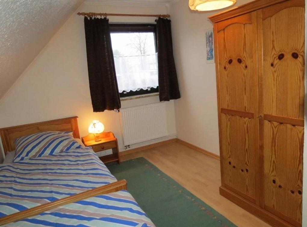 Die Ferienwohnung hat 2 separate Schlafzimmer (jeweils ca. 10m²) mit jeweils 2 Einzelbetten (2m lang). Es stehen synthetische Bettdecken und Kopfkissen zur Verfügung.