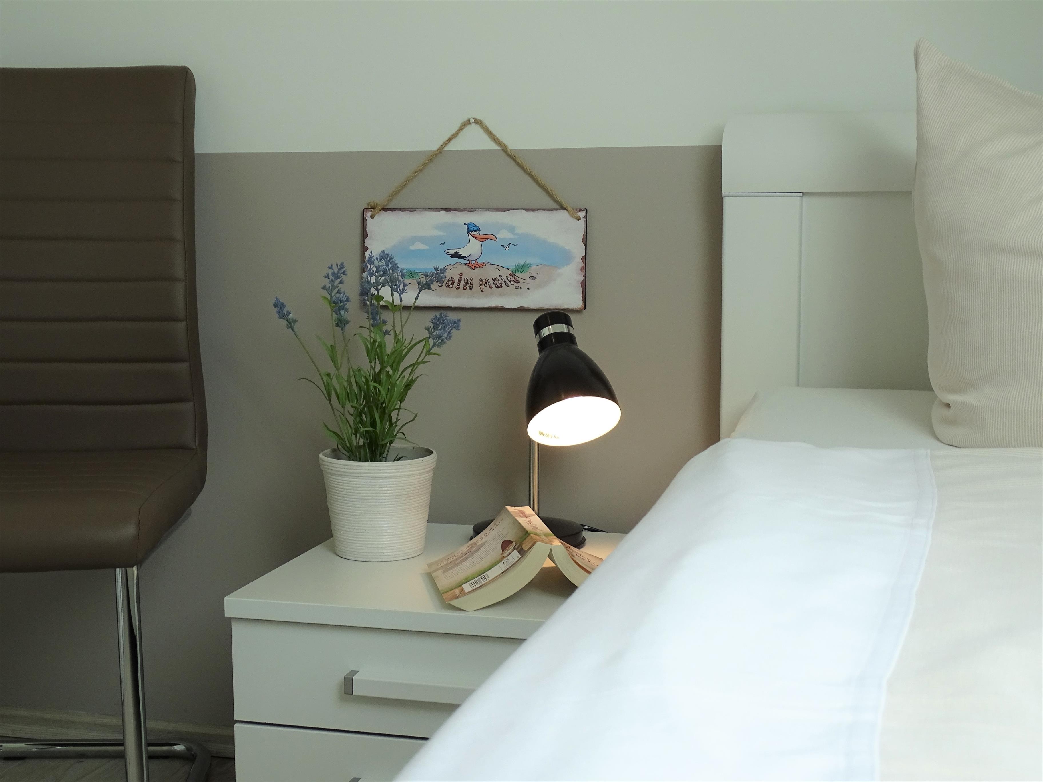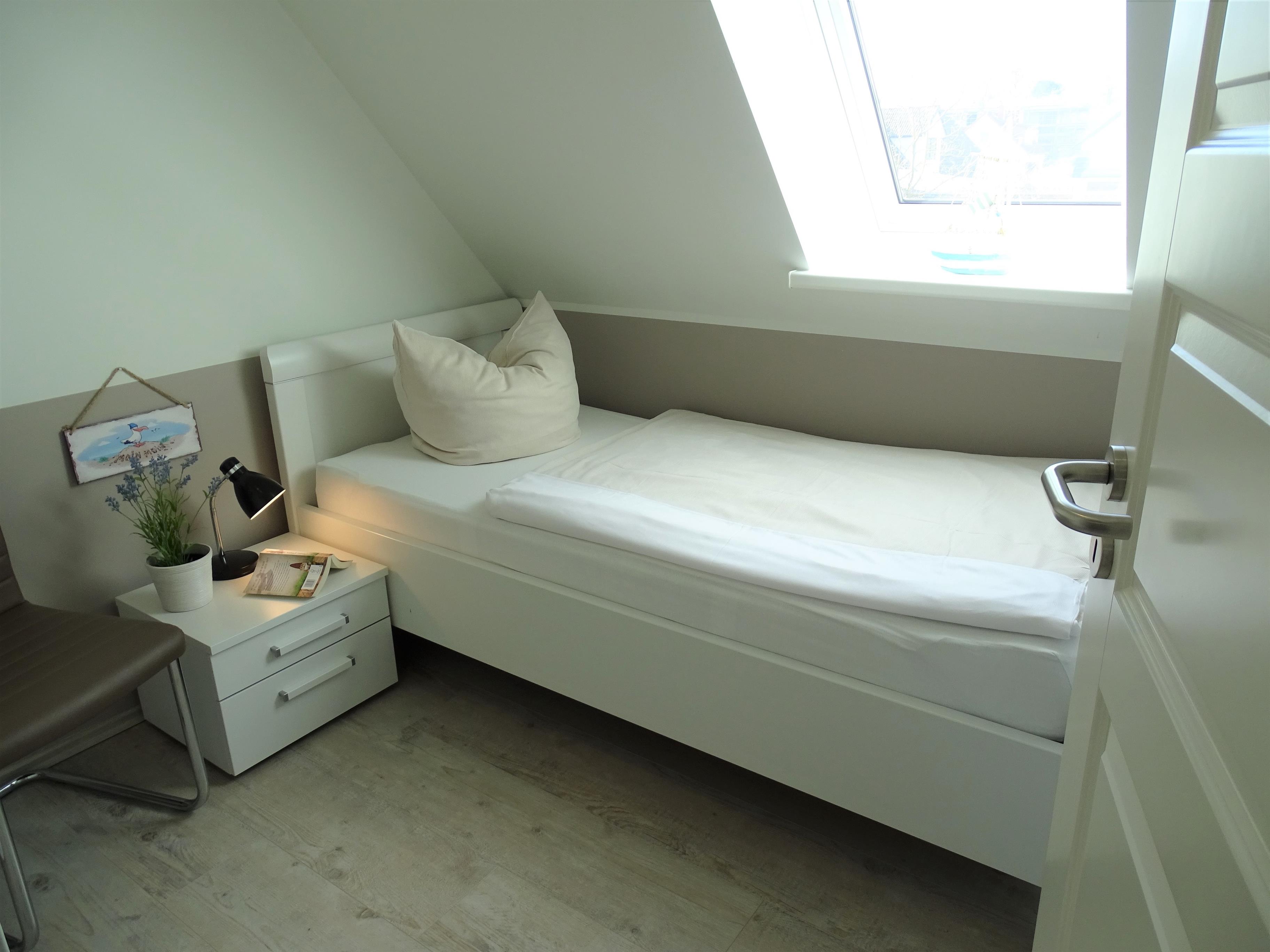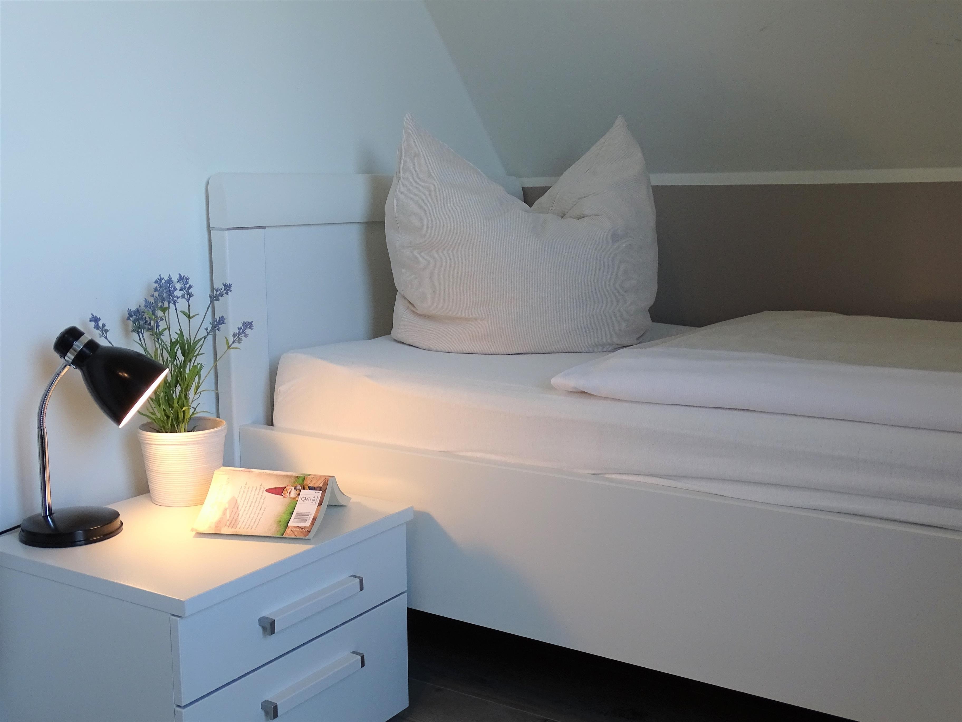 1 Schlafzimmer mit Doppelbett 180x200 und Fernseher sowie jeweils 1 Schlafzimmer mit einem Einzelbett 90x200. Ein Badezimmer mit Sauna und Dusche und ein Gäste- WC stehen in diesem Ferienobjekt zur Verfügung.
