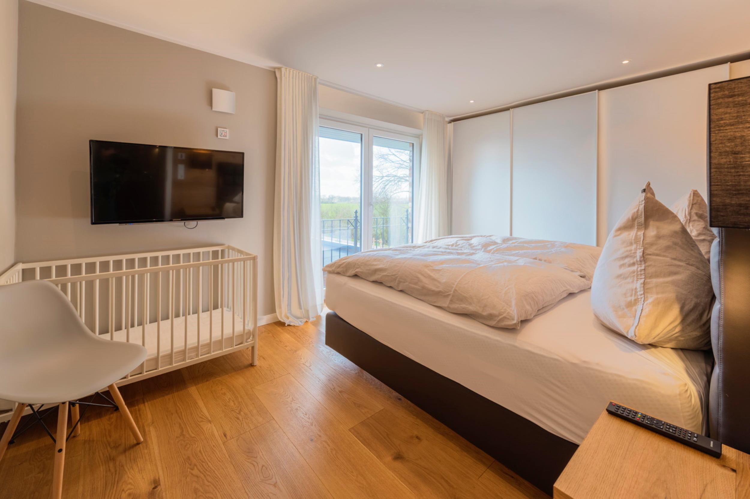 - Schlafzimmer (5) (Teilmeerblick): mit Boxspringbett (1x200 cm x 200 cm), Nachttische, Bettleuchten, Außenrollo, TV und Kleiderschrank.
