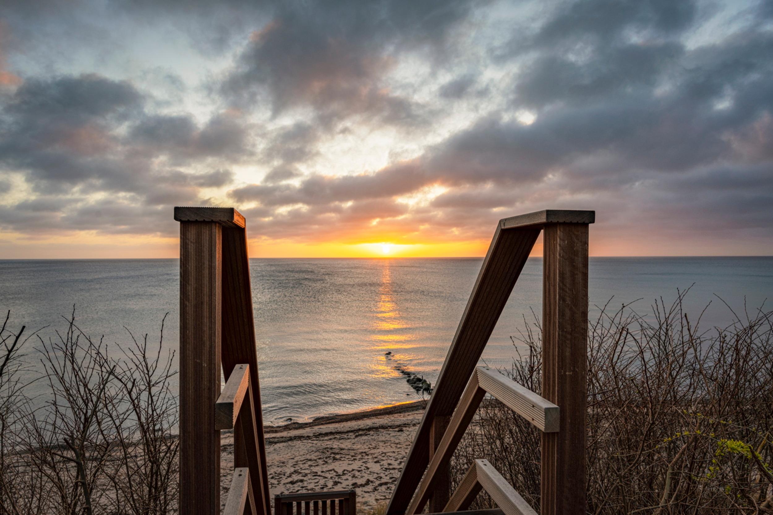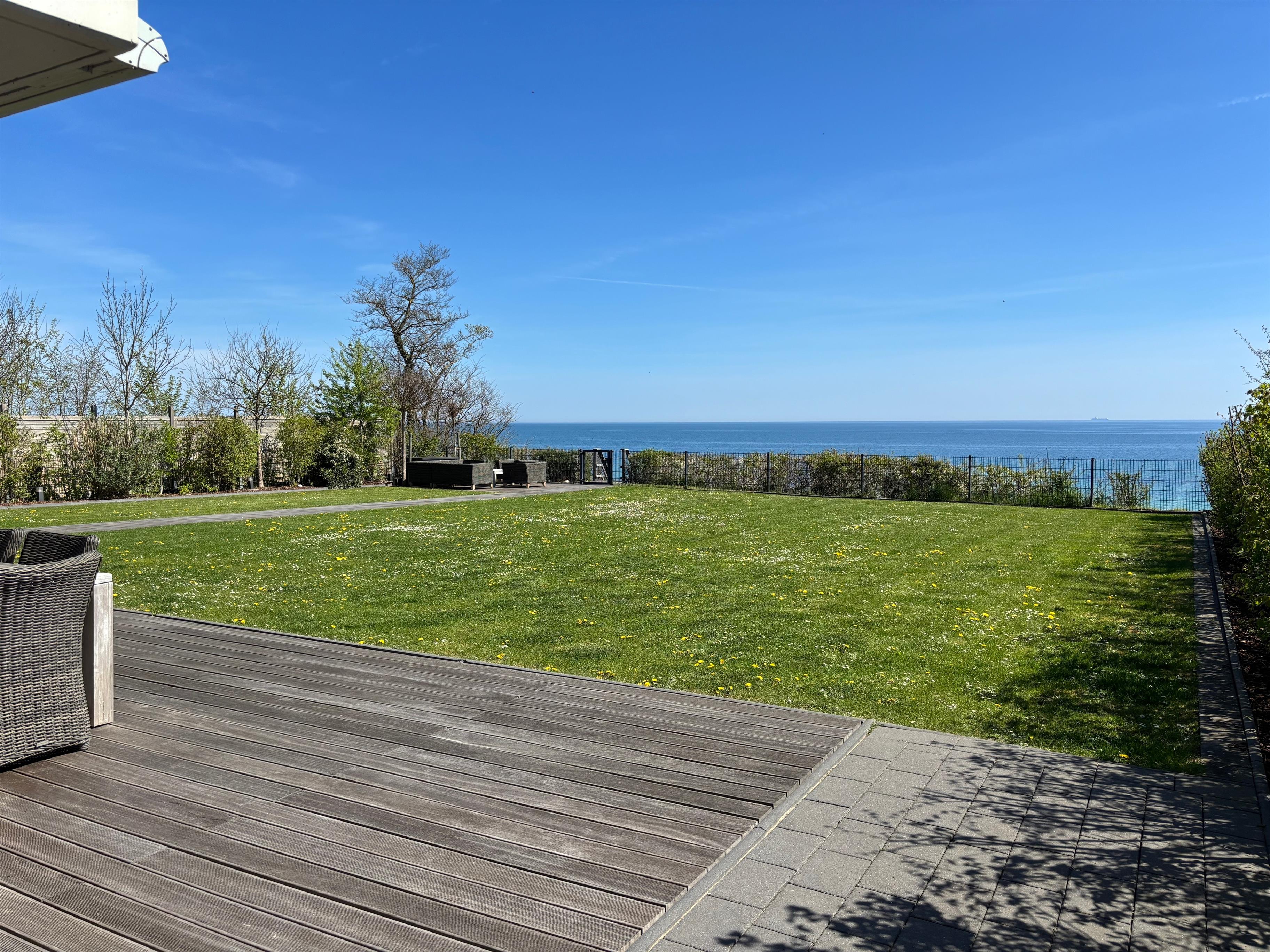 Vom Wohnzimmer aus gelangen Sie auf die große Holzterrasse mit Meerblick, auf der ein Grill (Holzkohle), ein großer Tisch mit Stühlen, Sonnenliegen und ein direkter Zugang zur Ostsee (Treppe) auf Sie warten.