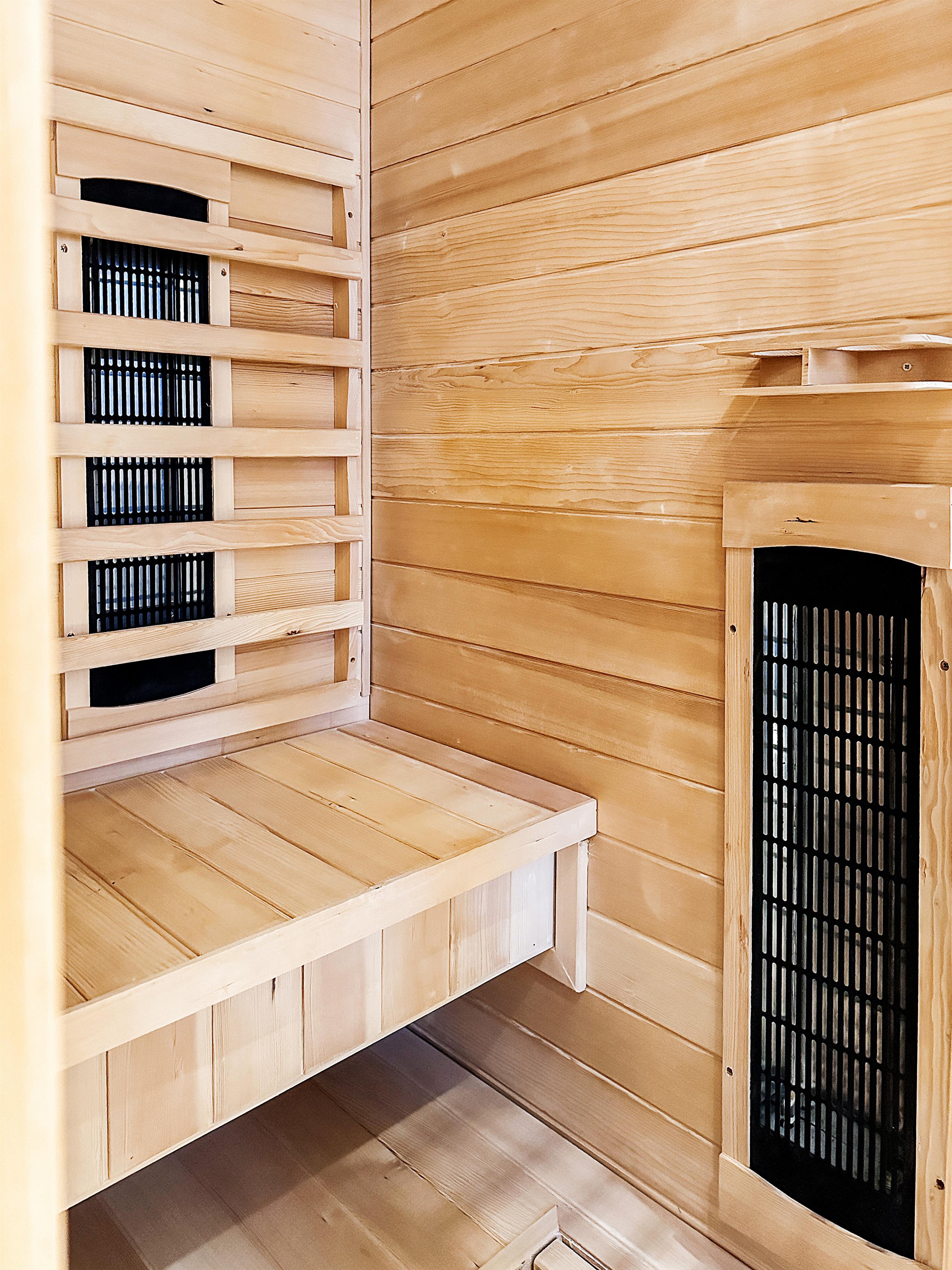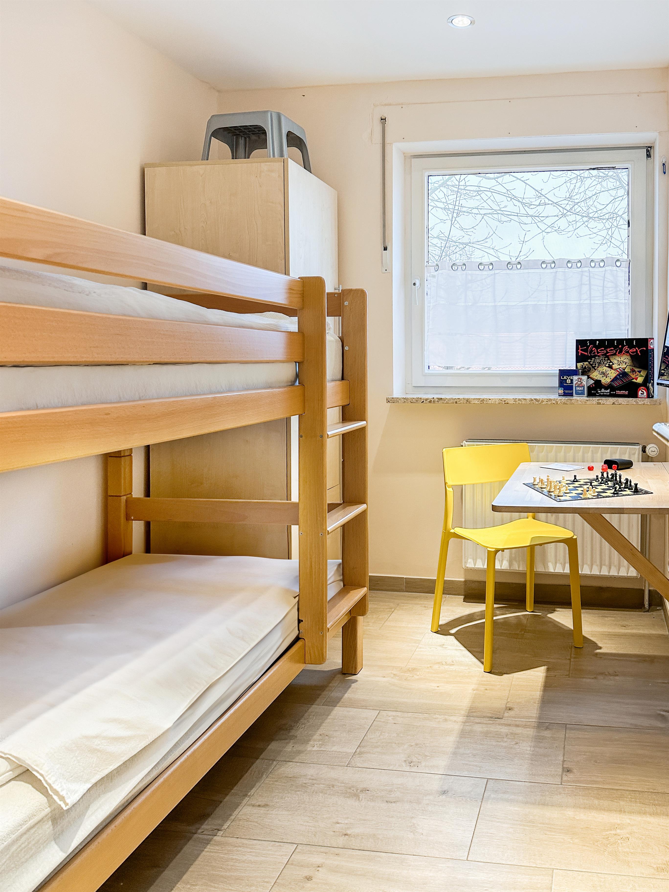 Das erste Schlafzimmer hat ein Doppelbett (160 cm x 200 cm), Kleiderschrank, TV und Außenverdunkelungsrollo. Das zweite Schlafzimmer ist mit einem Etagenbett (90 x 200 cm), Kommode, TV und Außenverdunkelungsrollo ausgerüstet. Das Duschbad mit Tageslicht beinhaltet ein WC, Spiegelschrank und eine kostenfreie Waschmaschine. Die schicke Infrarotsauna ist in einem separaten Raum untergebracht.