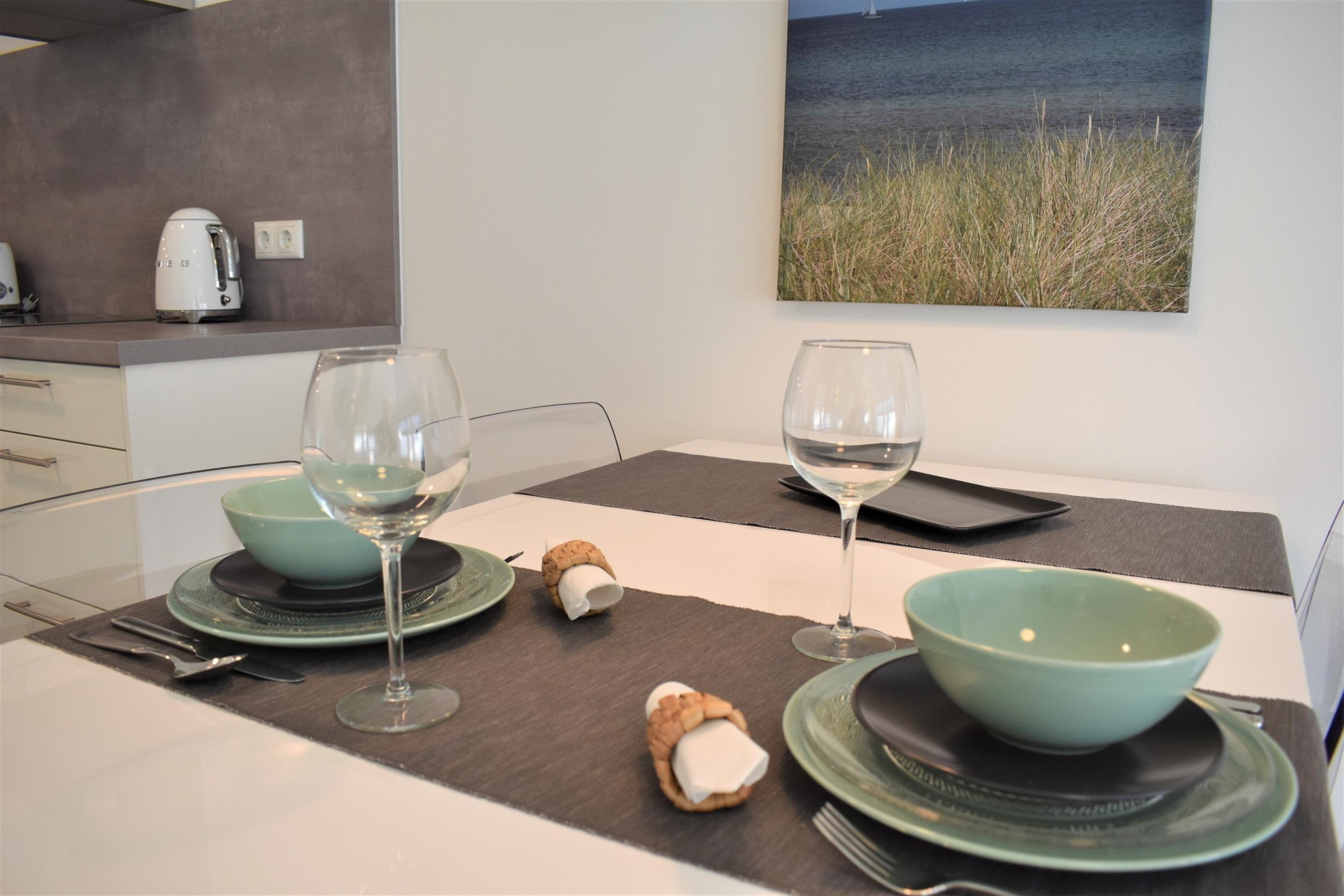 Offene Küche mit Geschirrspüler, Backofen und vielem mehr. Wohn-/Esszimmer mit Couchgarnitur, TV, Esstisch mit Stühlen, elektrischen Außenrolladen und direktem Zugang zum Südbalkon mit Strandkorb.