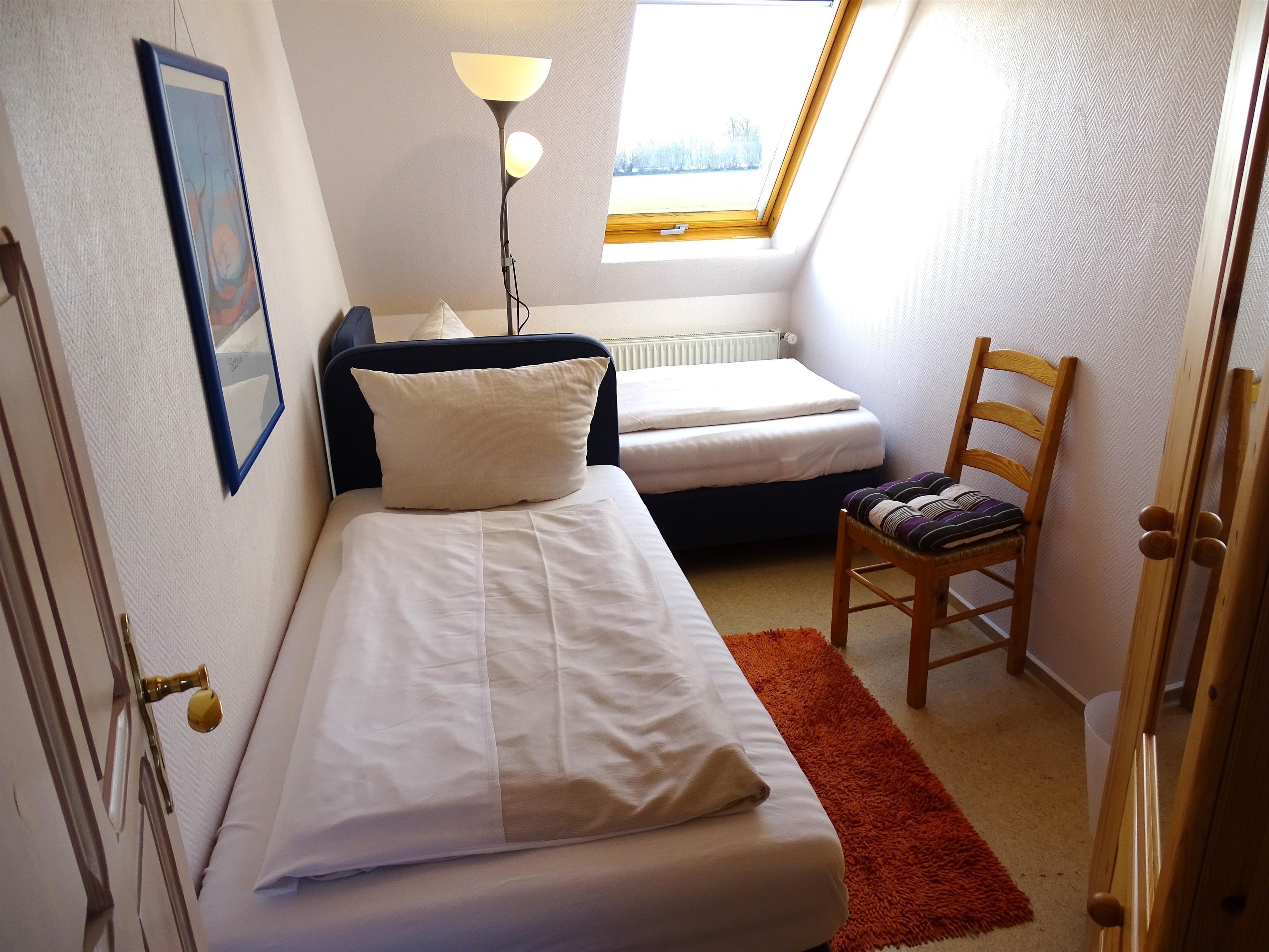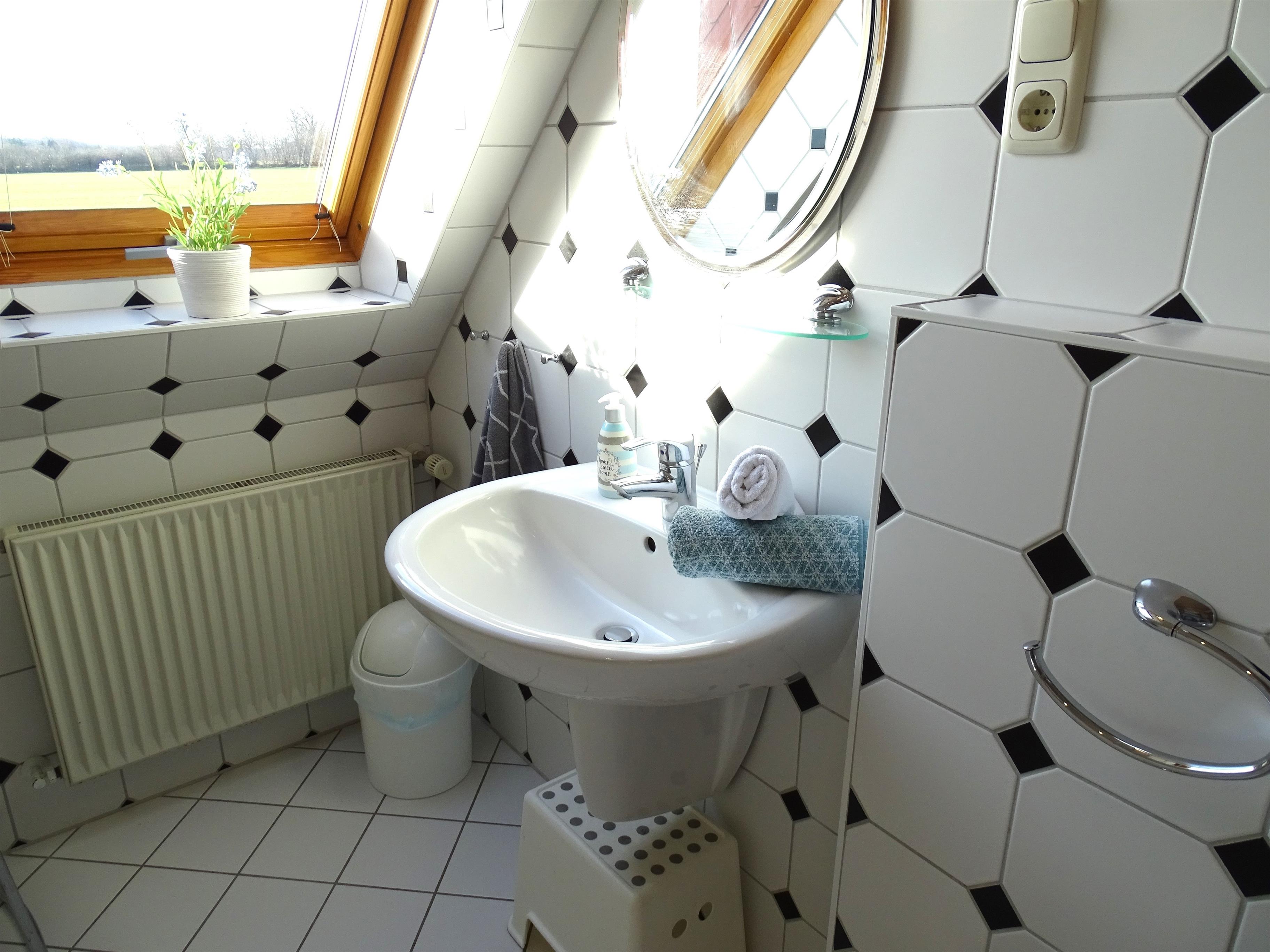 Die 3- Zimmer Ferienwohnung befindet sich im 1. Stock des Hauses. Sie erreichen die Wohnung über eine stabile Aussentreppe. Aufgeteilt ist sie in: Vorflur-Flur, einem "kleinen" Schlafzimmer mit 2 Einzelbetten, Kleiderschrank und Rollo, einem etwas größeren Schlafzimmer mit Doppelbett, Nachttischen, Kleiderschrank und ebenfalls einem Rollo. Weiter geht es mit einer sehr gut ausgestatten Küche, mit einem kleinem Küchenesstisch und 2 Stühlen. Das neben der gepflegten und hochwertig ausgestatteten Küche befindliche Badezimmer, ist sehr geschmackvoll gestaltet. Hier befindet sich eine Badewanne (mit Duschstange und Vorhang), Waschbecken, Fön, Bidet und WC.