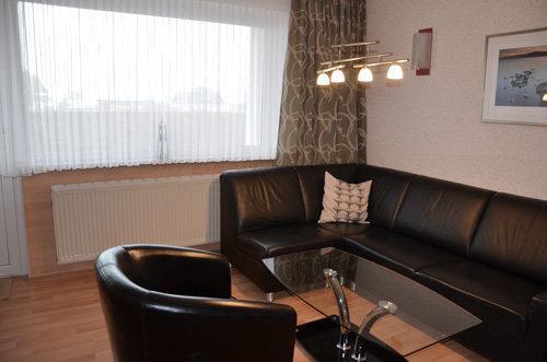 Außerdem gehören zur Ferienwohnung eine Wohnküche mit Essplatz für 3 Personen, ein großes Vollbad und ein Flur.