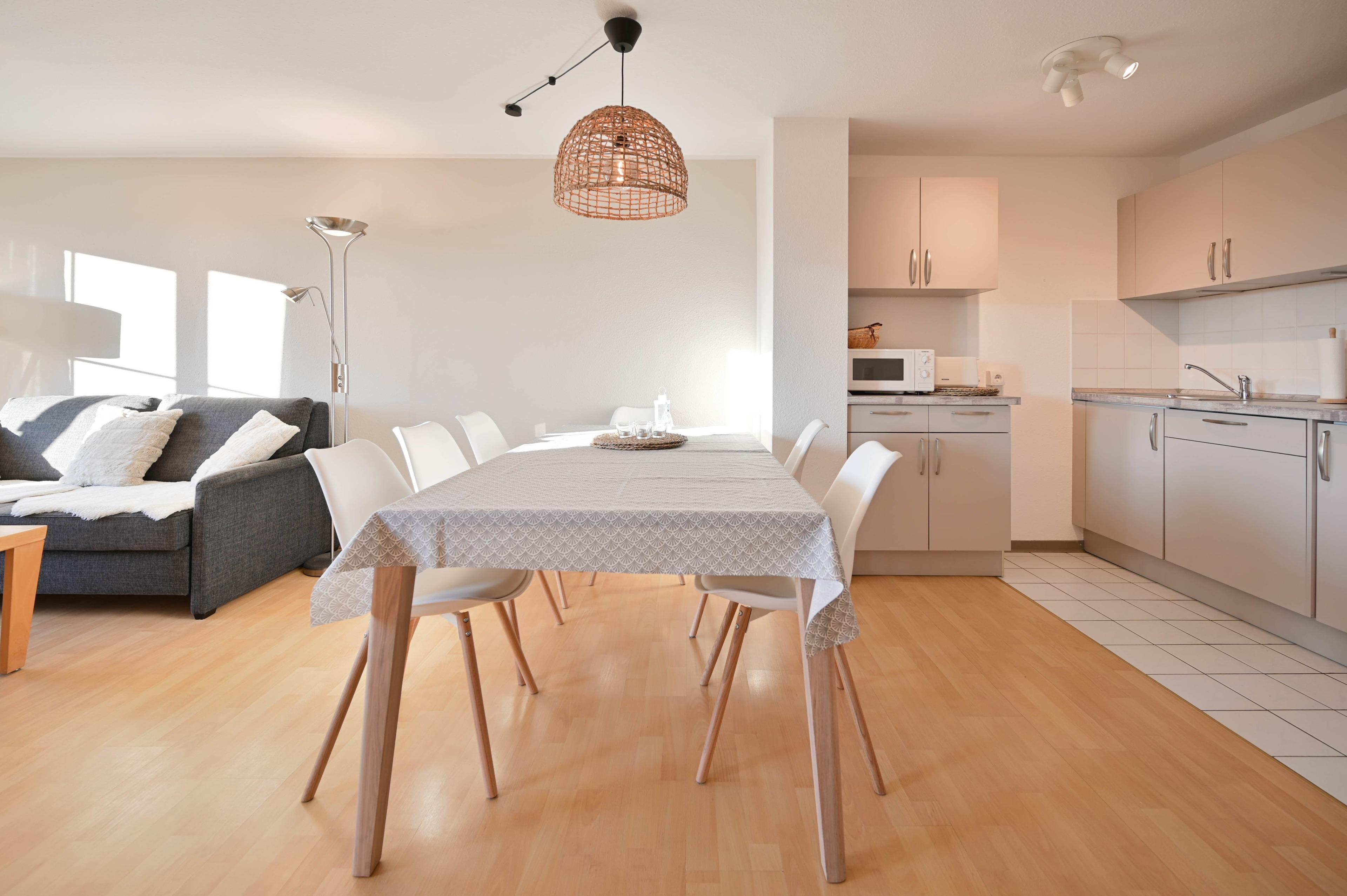 Die Ferienwohnung ist im nordischen Stil, hell mit sanften Farben und natürlichen Materialien, eingerichtet.