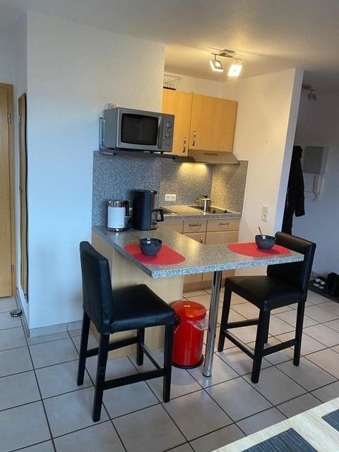 Die offene Küche als zentraler Ort mit Esstheke und zwei Barhockern ist bestens ausgestattet. Angrenzend befindet sich der Essbereich mit Tisch und 4 Stühlen.