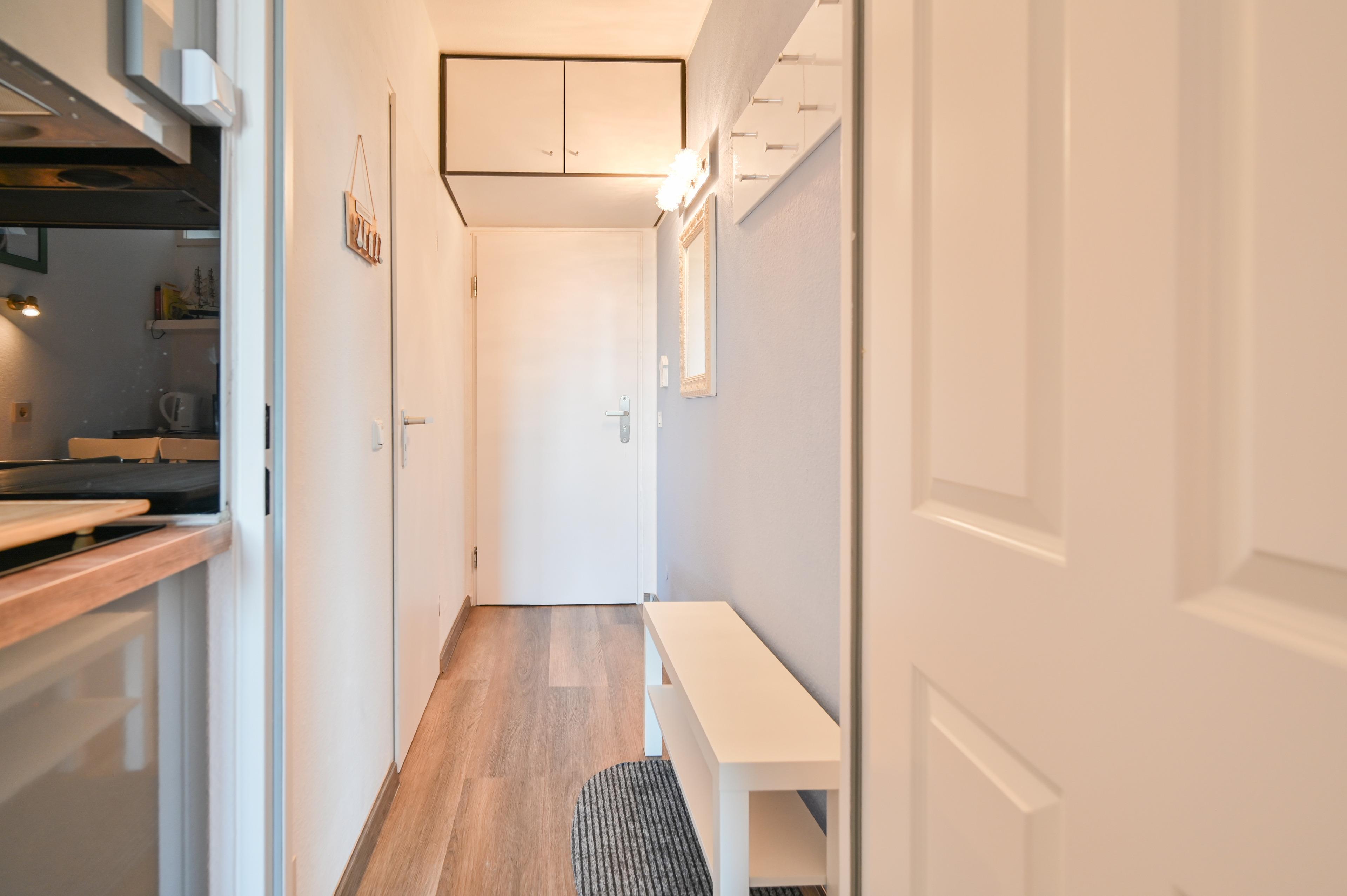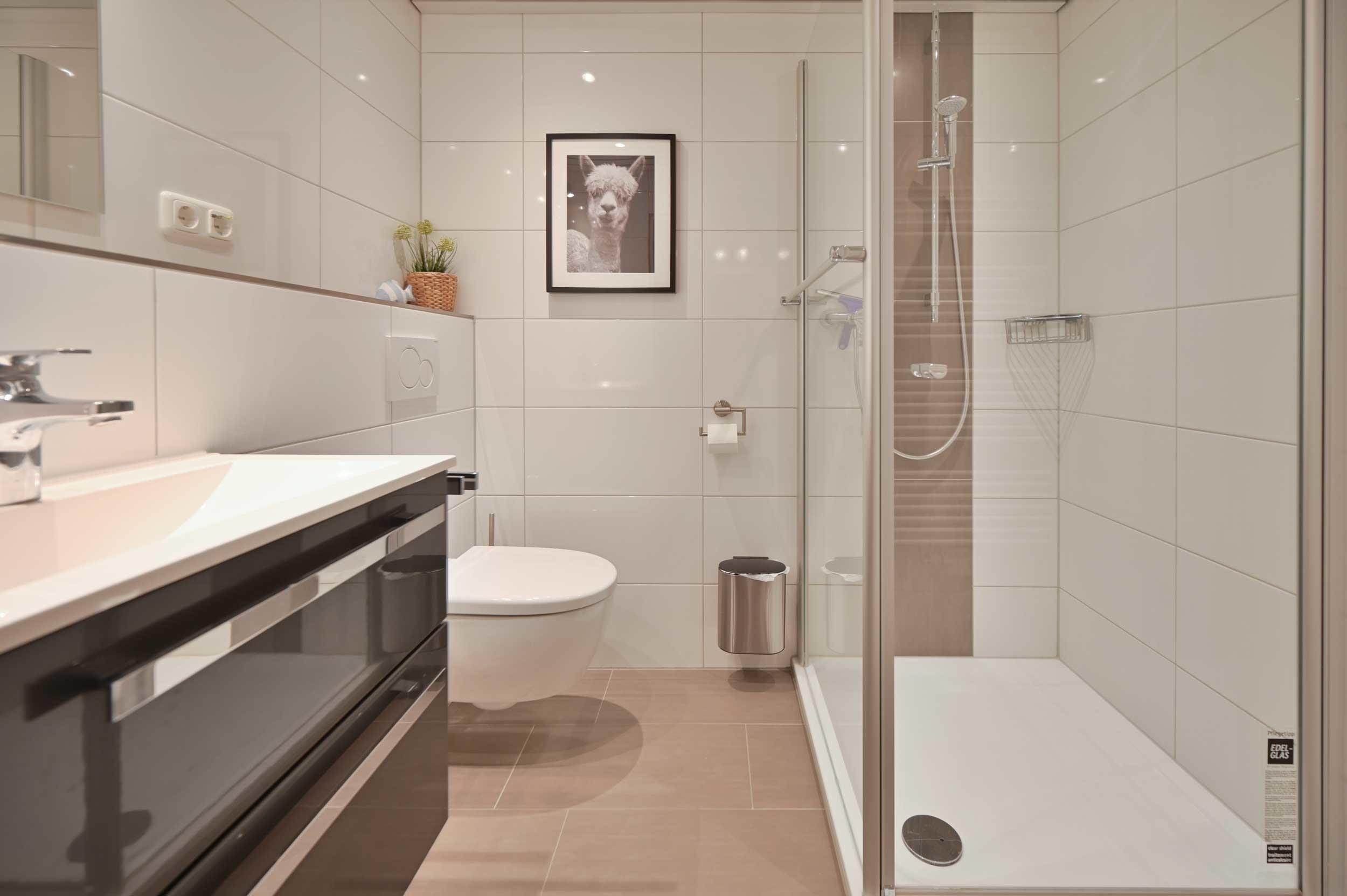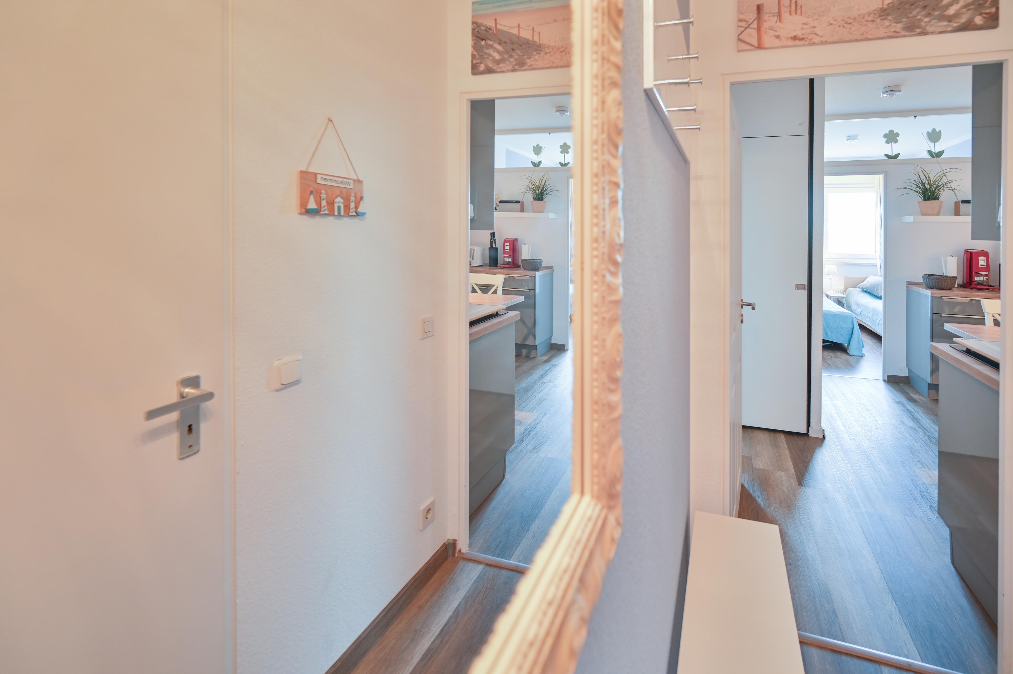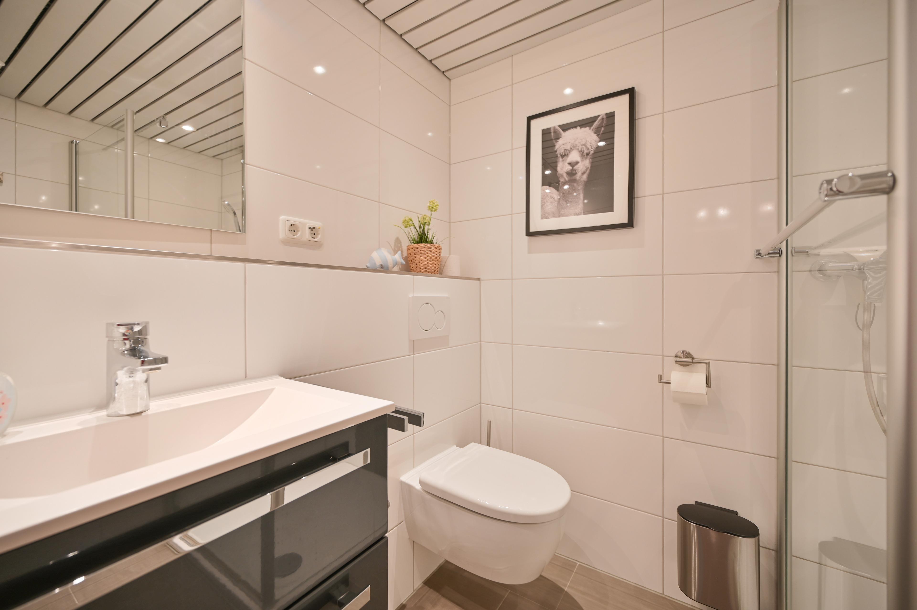Die Ferienwohnung von Familie Bräuer verfügt zudem über ein neues Bad (2019 renoviert) mit Dusche und WC. Der Flur ist mit einer Garderobe, einem Schuhschrank und einem Spiegel ausgestattet.