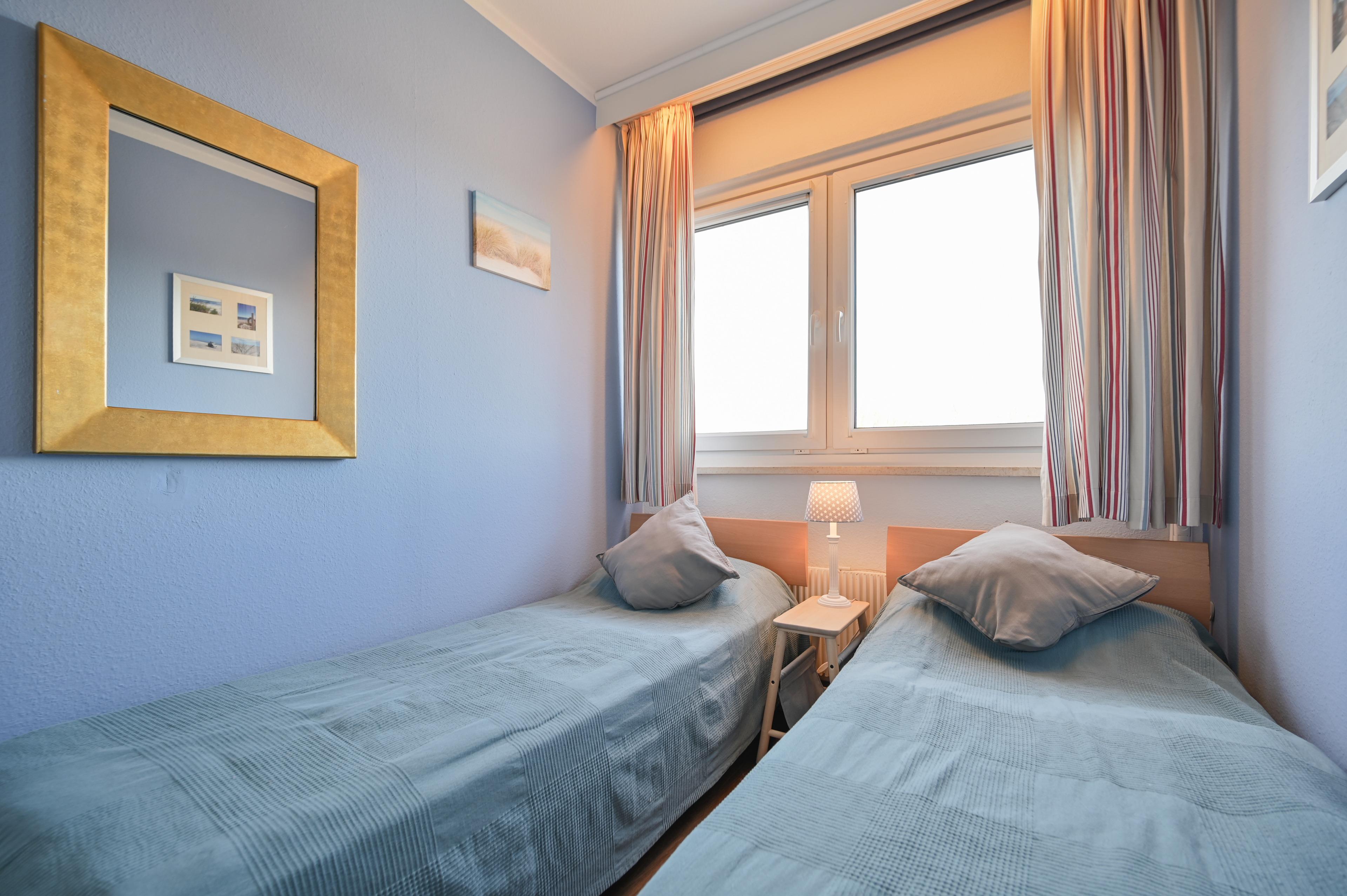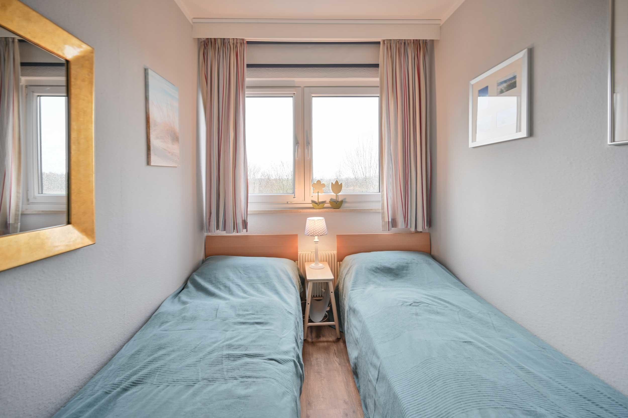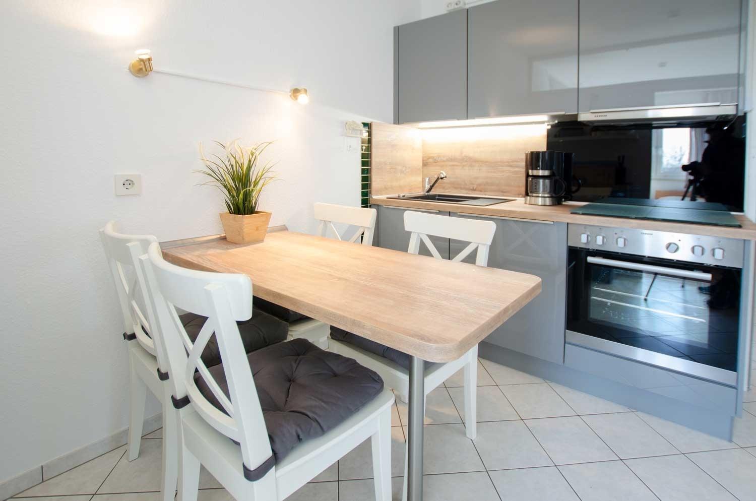 Der separate Schlafraum verfügt über zwei Einzelbetten 80*200, einen Kleiderschrank und Nachtschrank und Fernseher. In der modernen Küche können Feriengäste am Tisch mit den vier Stühlen gesellige Mahlzeiten einnehmen.