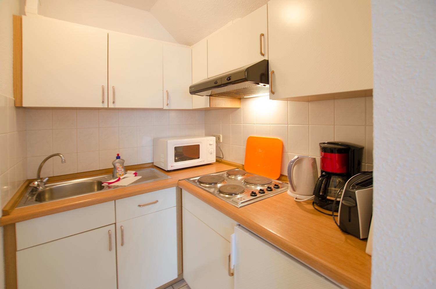 Die Ferienwohnung verfügt über einen Wohnschlafraum mit Schlafcouch, ein neuer Blueray-DVD-Player mit App-Zugang von Netflix, Youtube und Amazon bei vorhandener Internetverbindung. Mit zwei Sesseln mit Kissen, einem Couchtisch, einem Esstisch mit vier Stühlen und mit einer integrierten Küche.