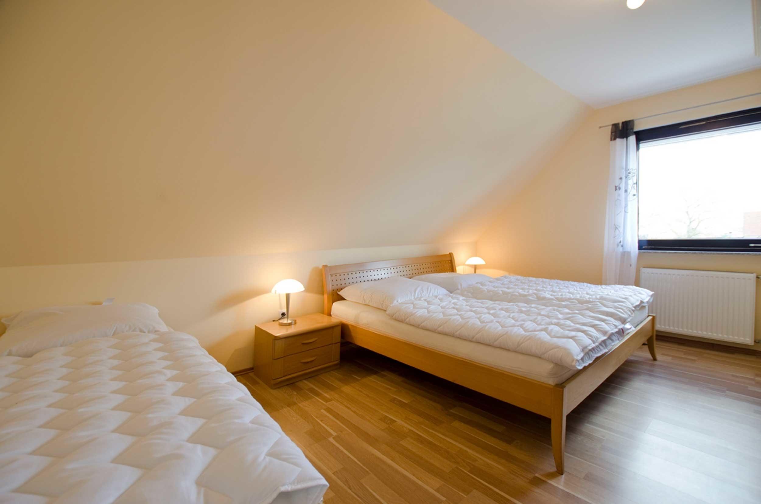 hier befinden sich 2 separate Schlafzimmer mit je einem Doppelbett und Kleiderschrank.