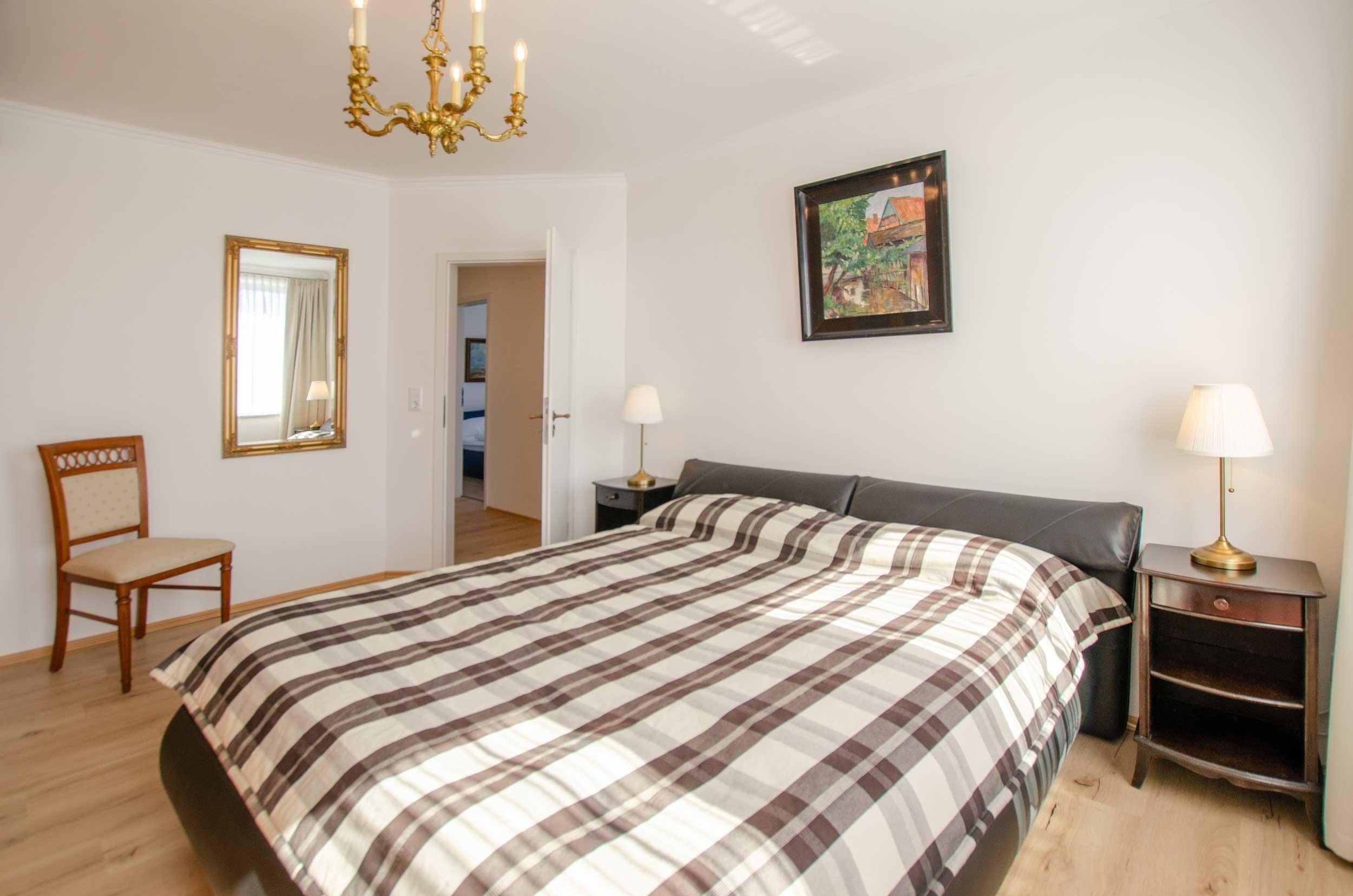 Ein separates Schlafzimmer mit Doppelbett, Nachttischen mit Leseleuchten und Kleiderschrank.