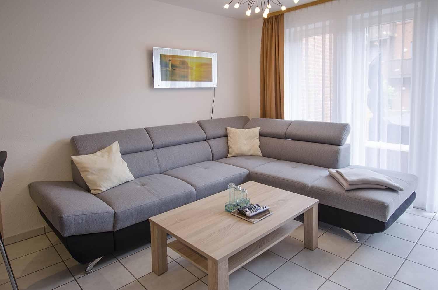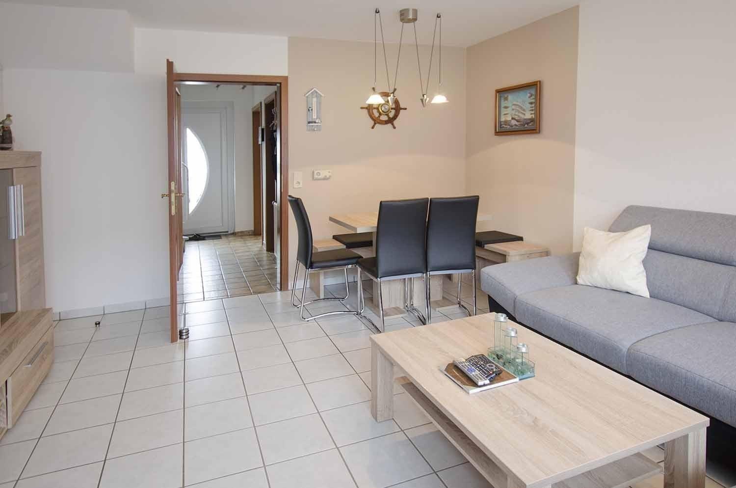 Das hübsche Ferienhaus von Familie Langer im Ostseebad Dahme verfügt im Erdgeschoss über ein Wohnzimmer mit Eck-Schlafsofa, Hocker, Couchtisch, Essplatz mit Eckbank und 3 Stühlen und Zugang zur möblierten Terrasse und zum schönen Garten.