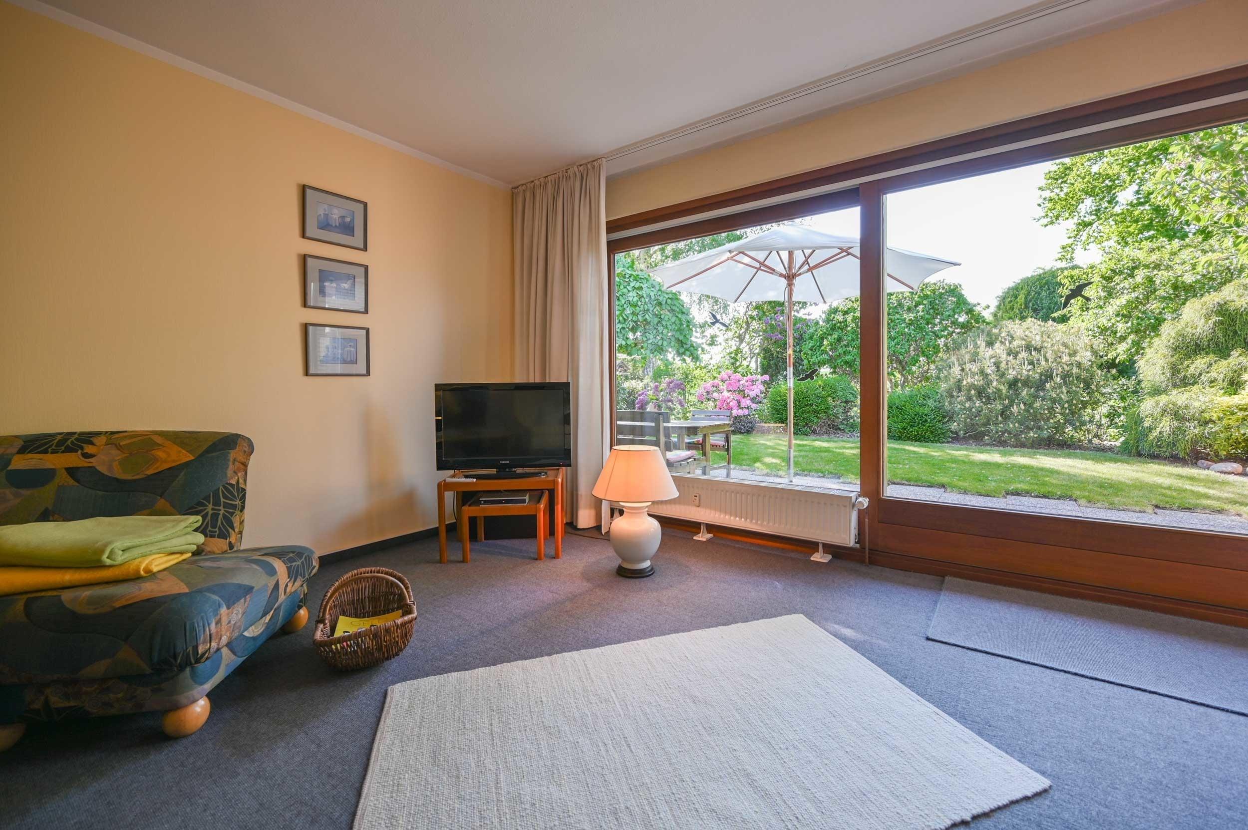 Das Wohnzimmer ist mit gemütlichem Ecksofa, Couchtisch, Lesesessel und Sekretär eingerichtet. Von hier aus haben Sie einen wunderschönen Panoramablick und Zugang zur gemütlichen Terrasse und zum Garten wo Sie die Sonne perfekt genießen können.