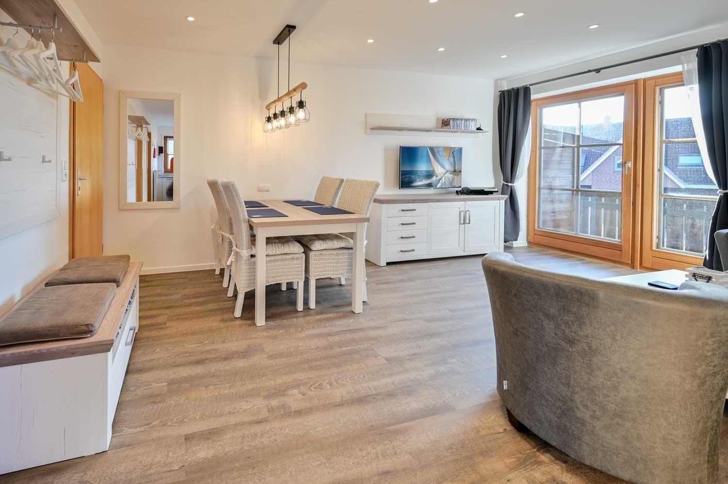 Das Wohnzimmer ist mit einem Sofa, zwei Sessel, Couchtisch, Kommode mit Flachbild-TV sowie einem Esstisch mit 4 Stühlen ausgestattet.