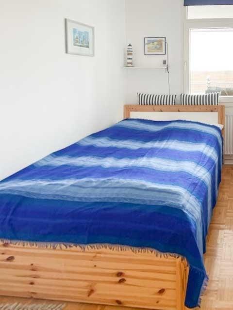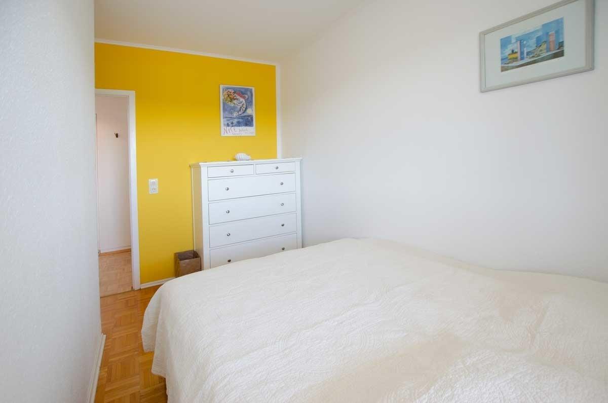 Im Schlafzimmer ist ein Doppelbett mit Lattenrost (140 x 200) und eine große Kommode, ein Kleiderschrank befindet sich im Flur.