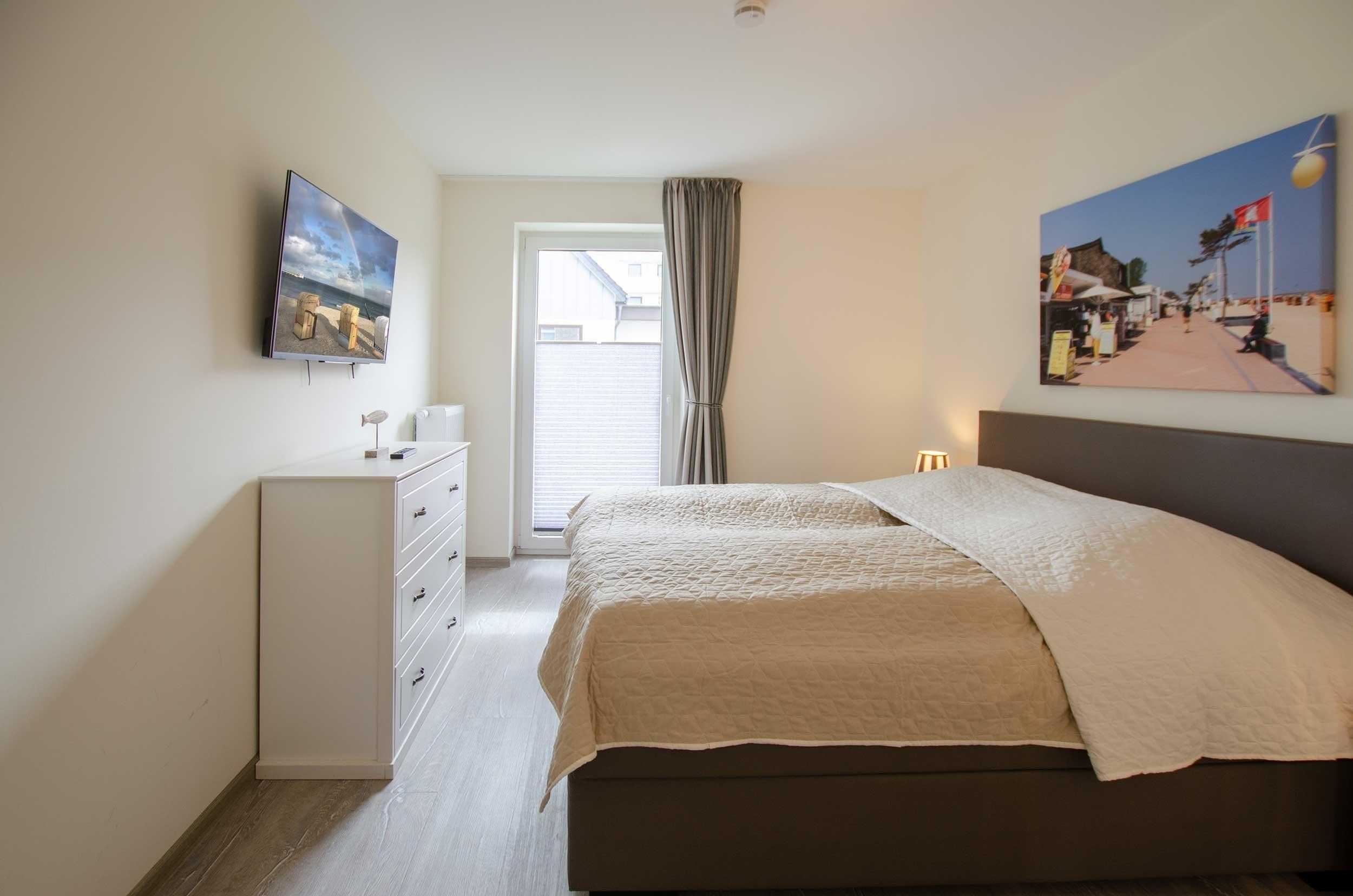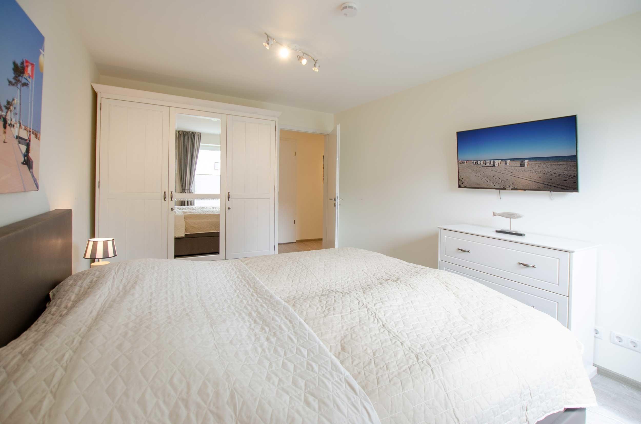 Im Schlafraum befinden sich außerdem ein zweites großes TV-Gerät und ein großer Kleiderschrank.