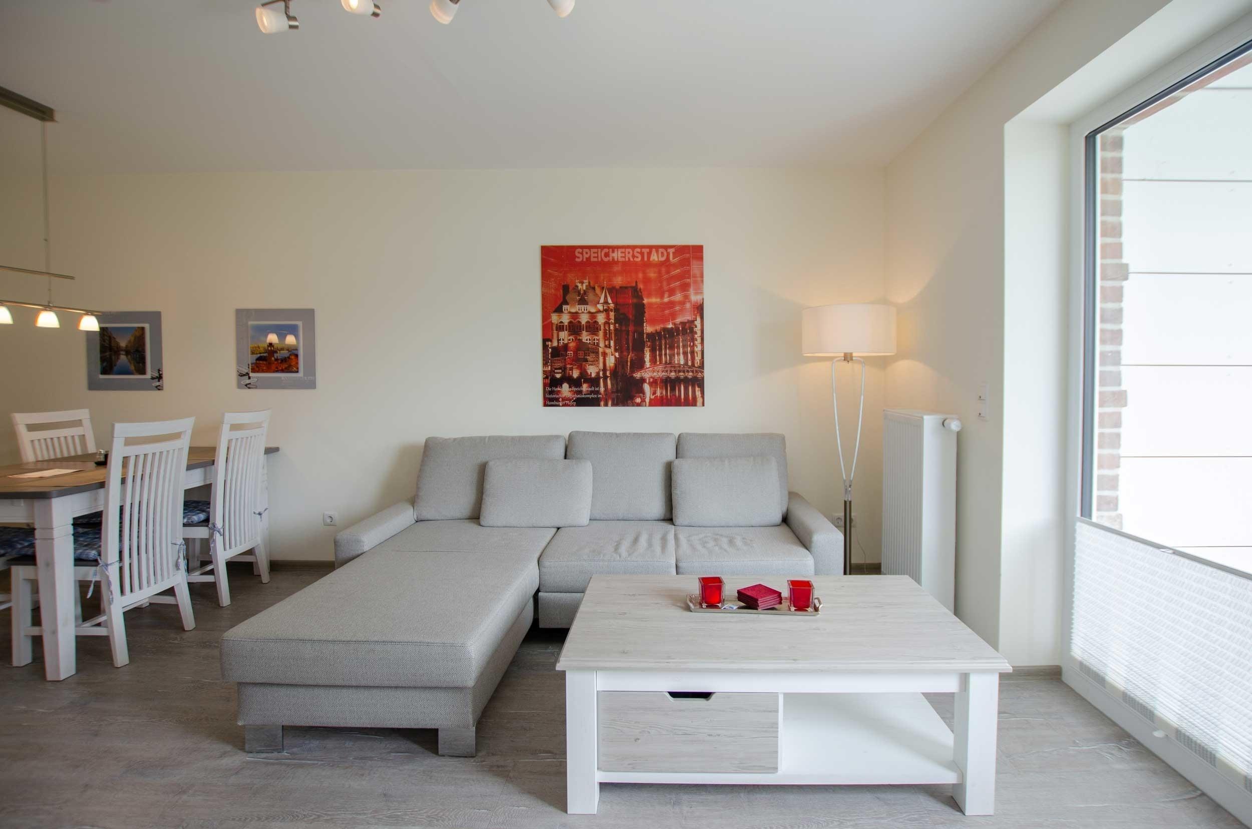 Das 2-Raum-Appartement verfügt über ein sonniges Wohn-Schlafzimmer mit Wohnzimmertisch, einem Sideboard und einer gemütlichen Eckcouch, die Gästen zusätzlich eine Schlaffunktion bietet.