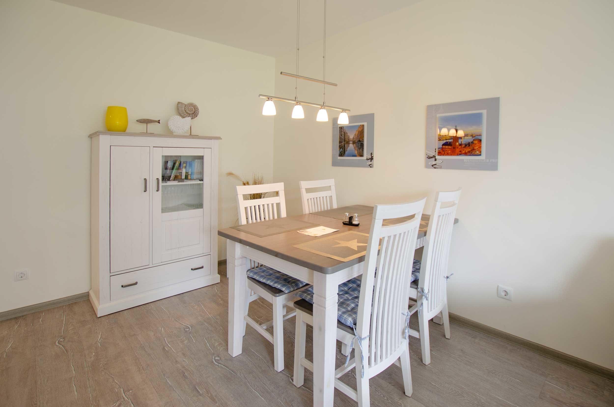 Der Essbereich ist ausgestattet mit einem Esstisch (für 4 Personen ausgelegt), den dazu passenden Stühlen und einem Geschirrschrank.