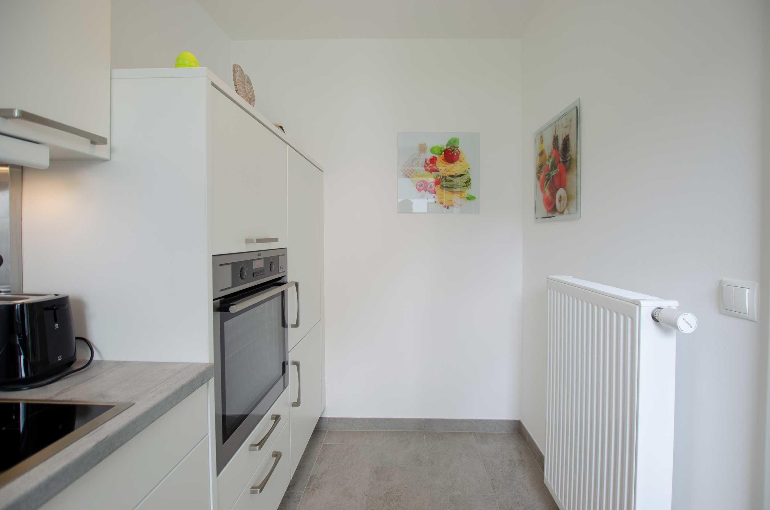 Die Küche verfügt über ein Cerankochfeld, einen Herd, eine Spülmaschine, eine Mikrowelle, eine Kaffeemaschine und einen Kühlschrank mit Gefrierfach.