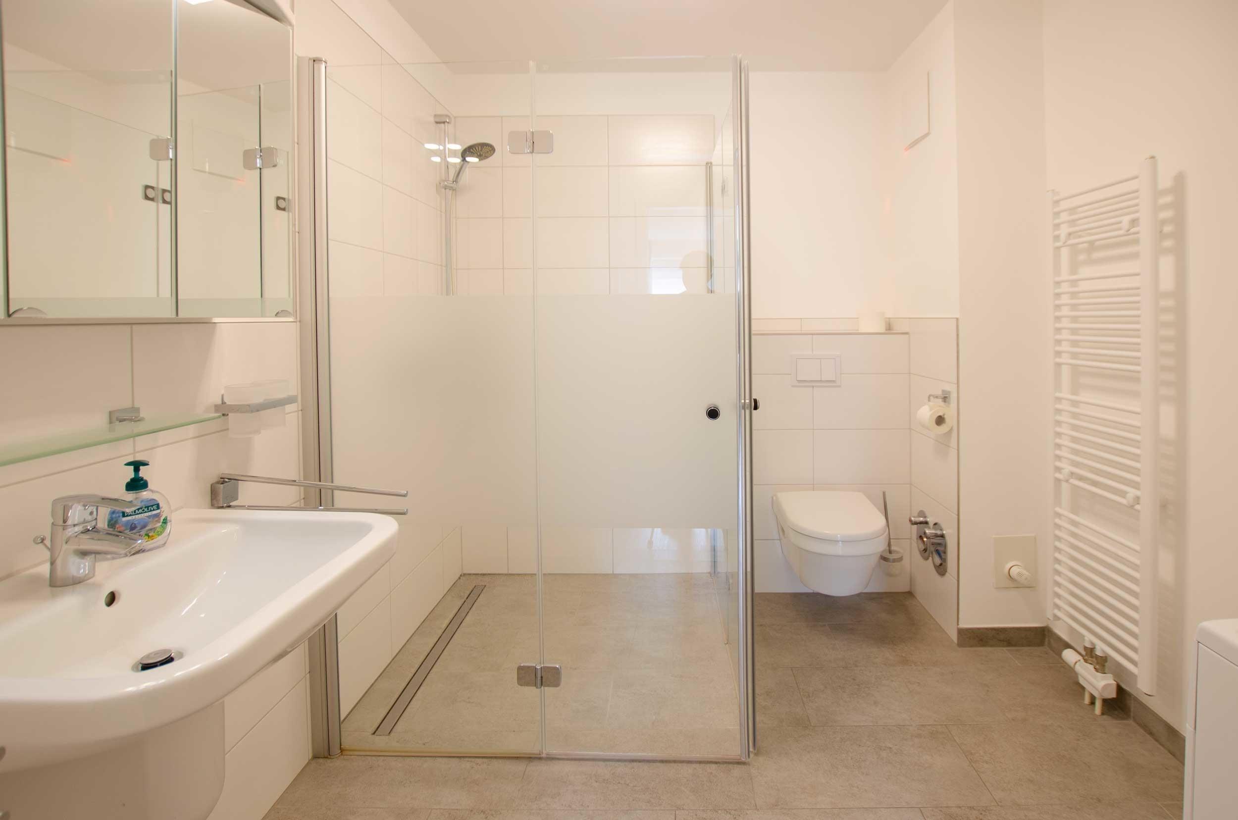 Das Badezimmer ist mit einer Dusche, WC, Spiegelschrank