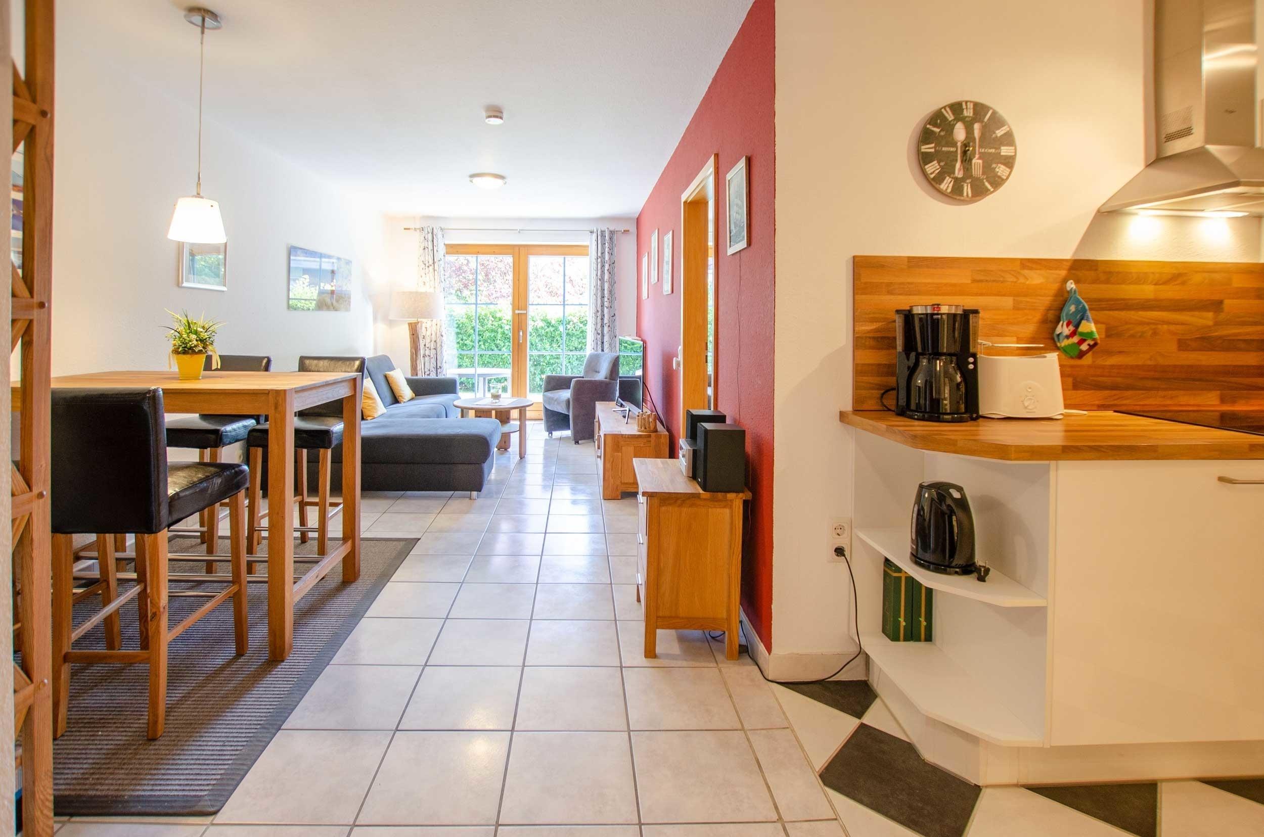 Die Ferienwohnung verfügt über zwei Zugänge zur Terrasse und einen direkten Gartenzugang.