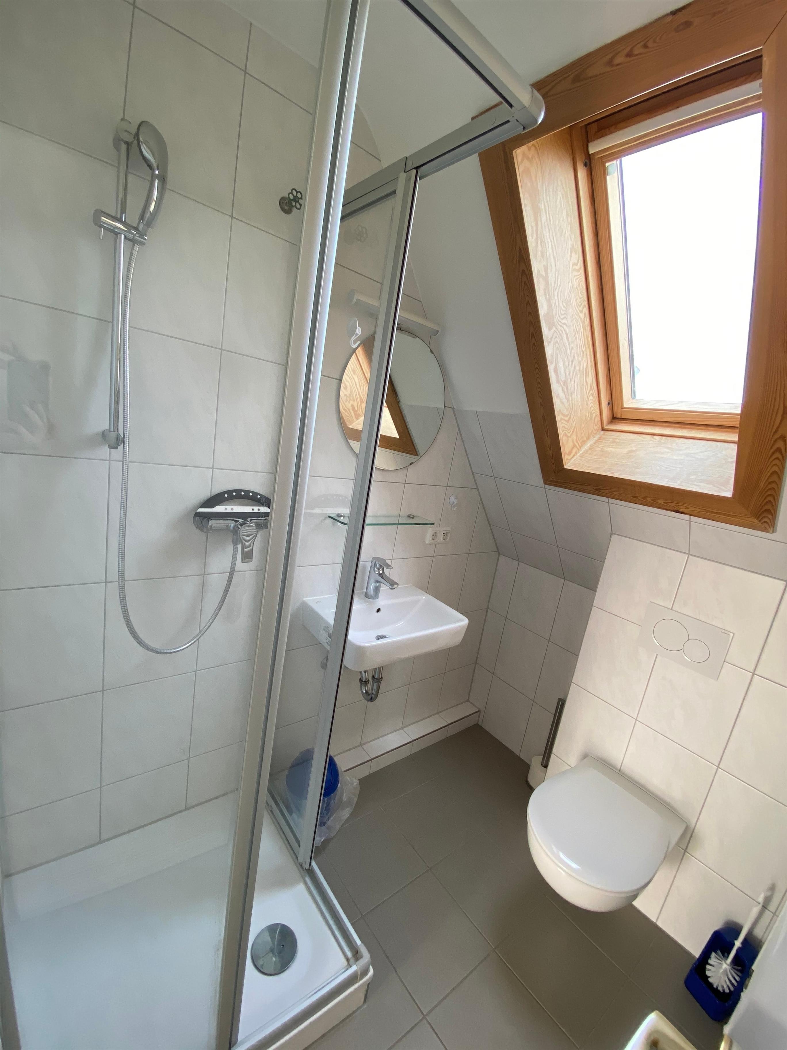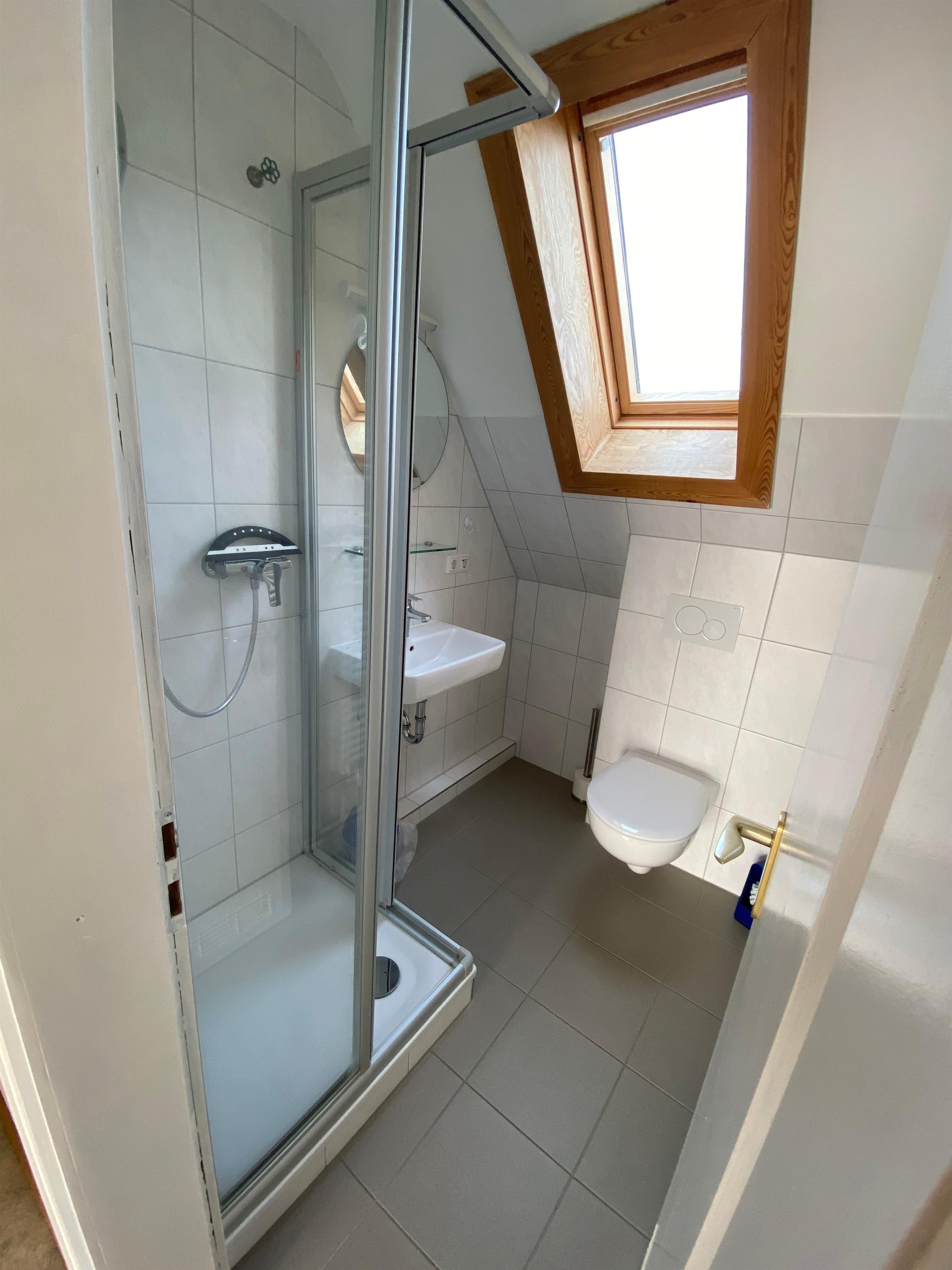Die Küche verfügt über einen Esstisch mit zwei Stühlen. Zur Wohnung gehört außerdem ein Bad mit Dusche und WC.