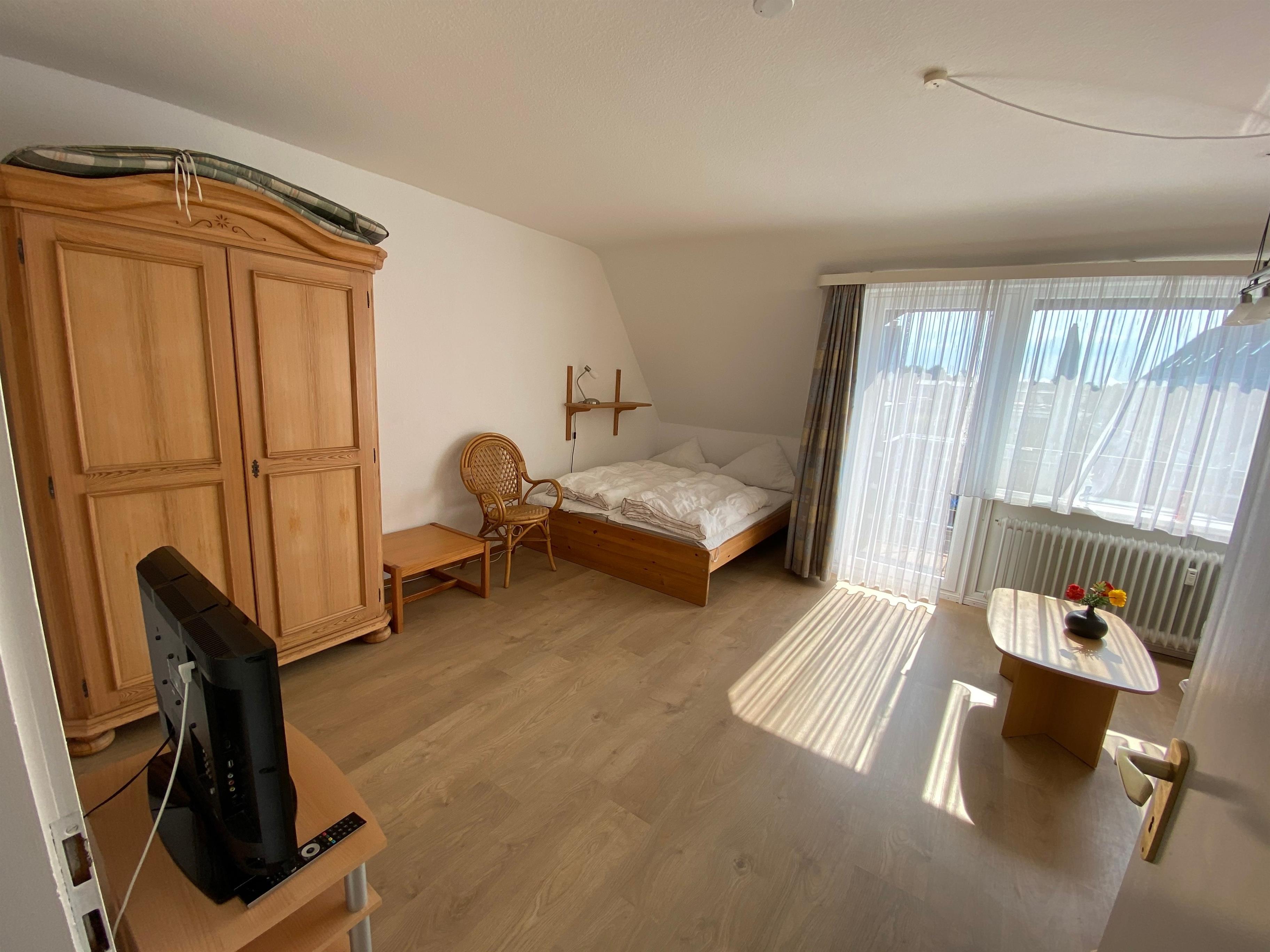 Das Wohnschlafzimmer verfügt über eine Couch, einen Sessel und eine Kommode. Auch ein Doppelbett ist im Wohnschlafraum vorhanden ebenso wie ein Kleiderschrank. Vom Wohnraum haben Gäste Zugang zum Balkon.
