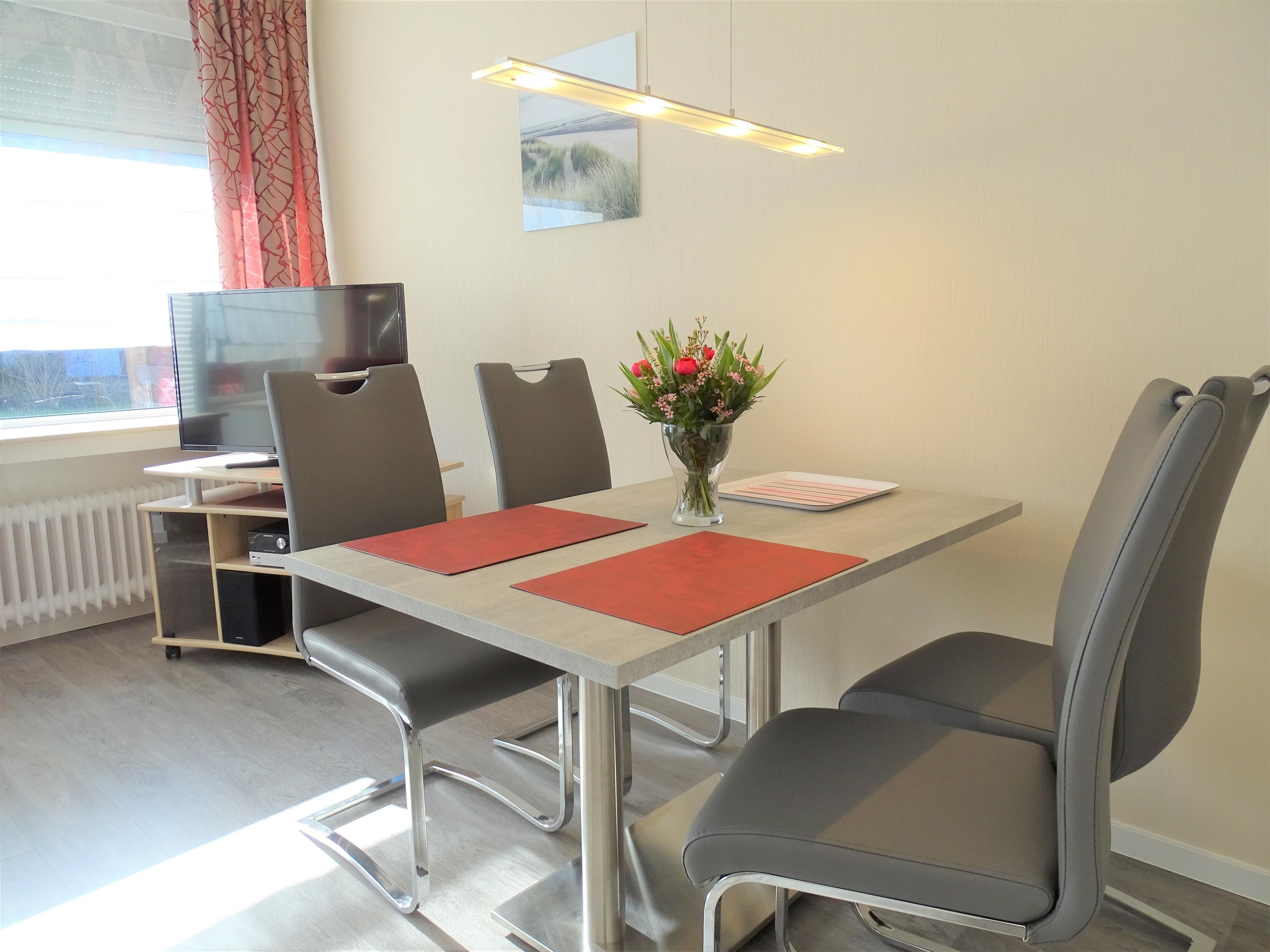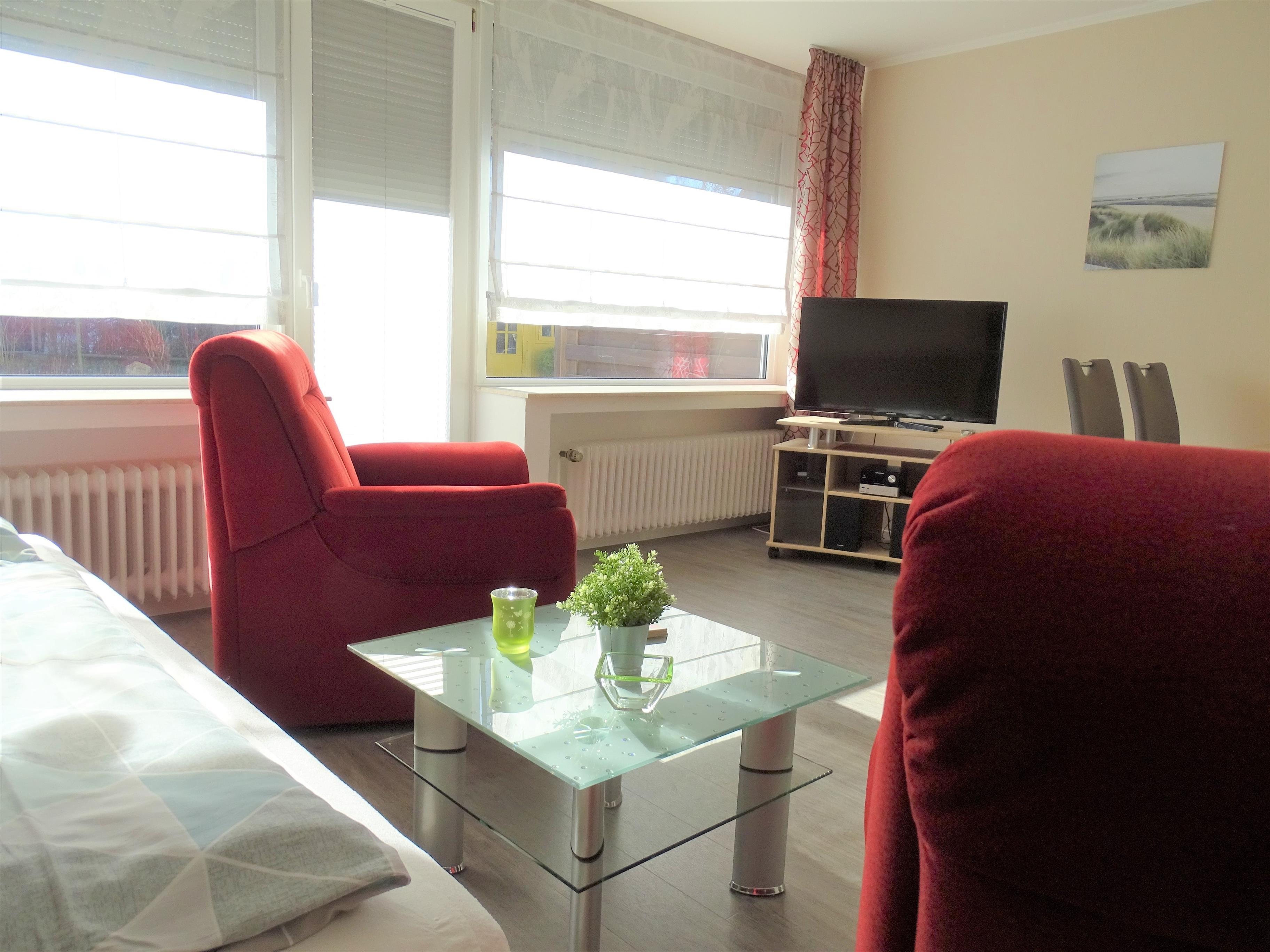 Der Wohnraum des Bungalow ist ausgestattet mit einem Sideboard, das ein ausklappbares Bett, 90 x 200 cm, verbirgt. Außerdem sind im ca. 24 qm großen Raum zwei Sessel, ein Couchtisch, ein Esstisch mit vier Stühlen, sowie auf einer Anrichte ein Farbfernseher mit Satelitenreceiver und Stereoanlage mit CD,BT,USB, MP3 vorhanden.