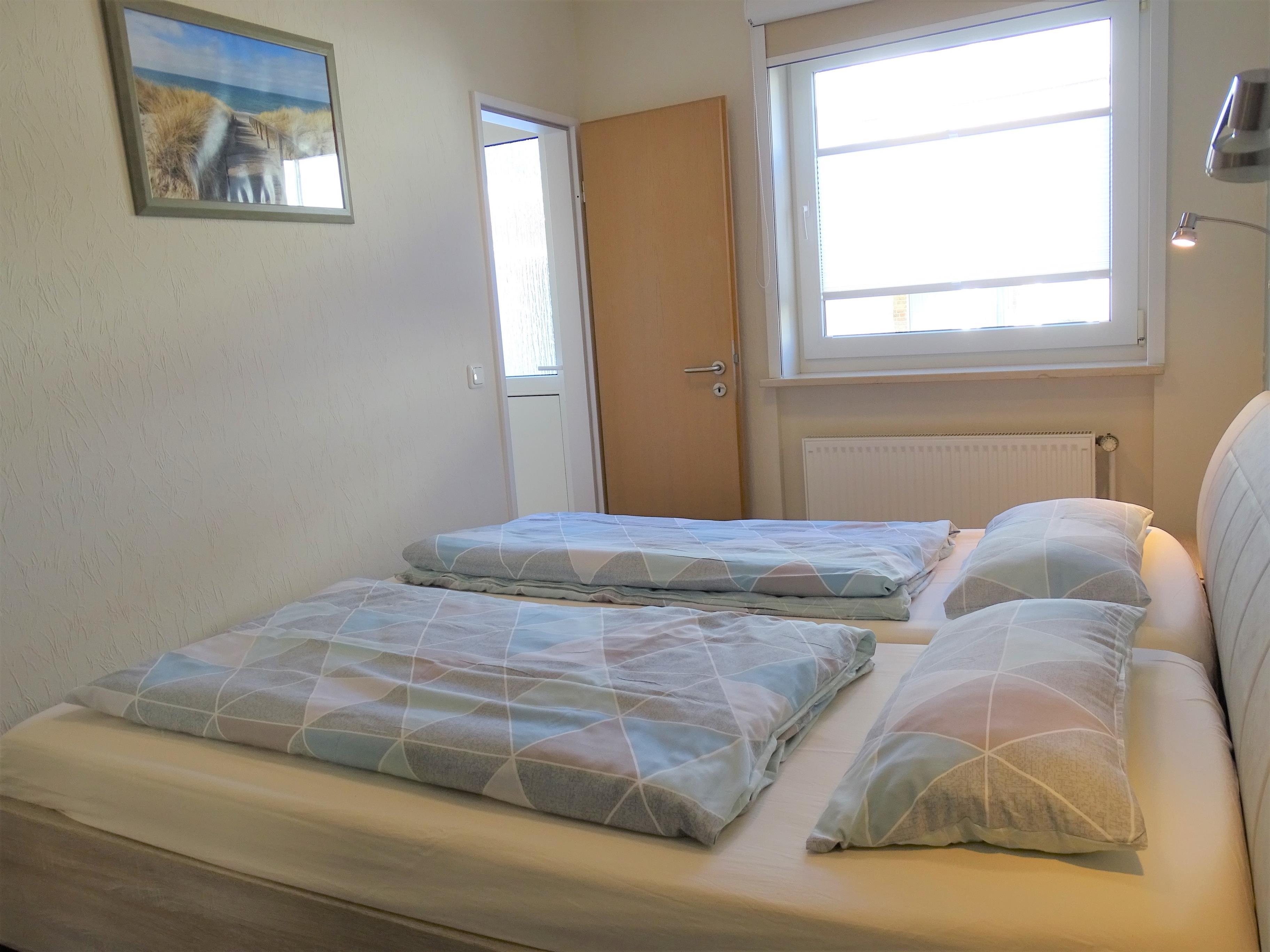 Im Schlafzimmer, das ca. 8 qm groß ist, steht neben dem Ehebett, zwei Matratzen mit je 200 x 90 cm, noch ein drei-türiger Kleiderschrank. Besonders platzsparend ist die, durch einen Umbau entstandene, "Moltke Lösung", nach dem Motto: getrennt marschieren, vereint schlafen, was nichts anderes heißt als: jeder betritt das Schlafzimmer vom Flur durch seine eigene Tür. Bettwäsche und Handtücher können für Ihren Urlaubsaufenthalt angemietet werden.