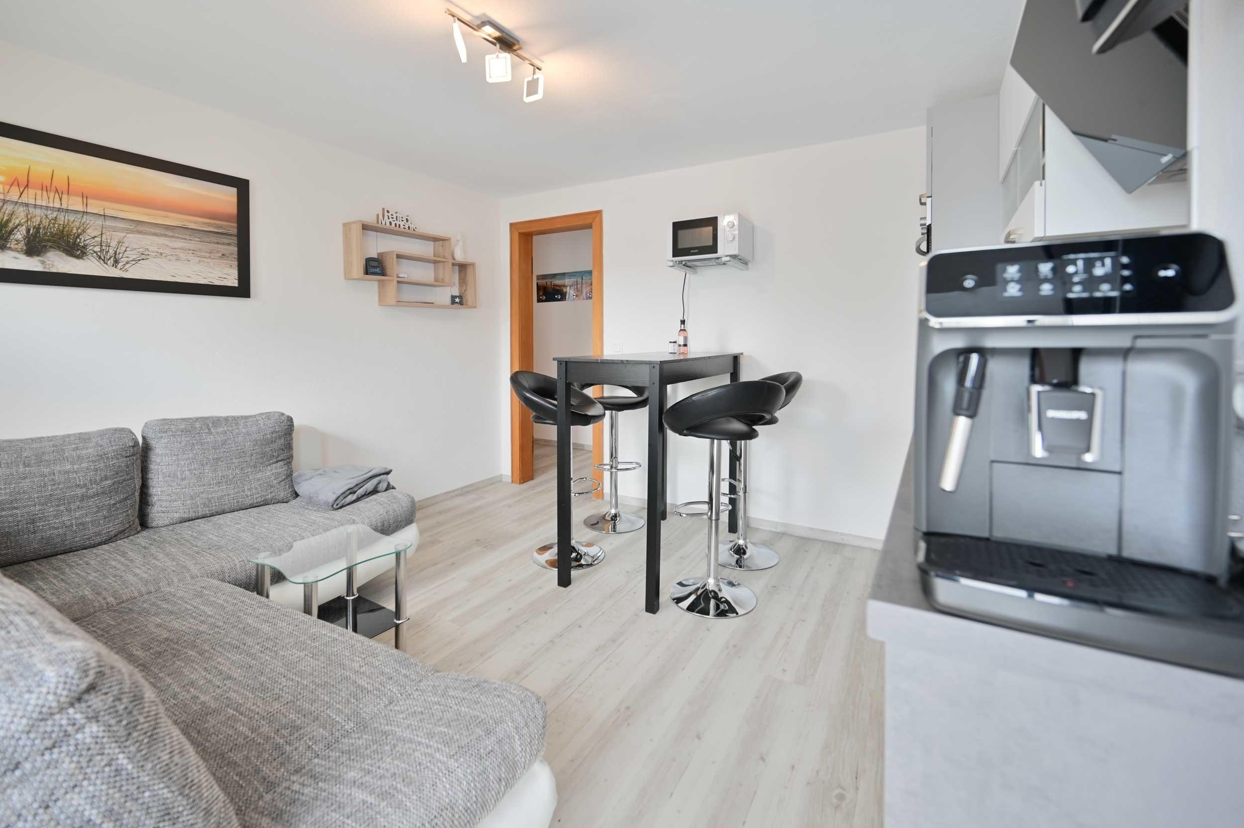 Die neue Küche verfügt über einen Backofen, ein Ceranfeld sowie eine Spülmaschine und einen Kaffeevollautomaten und eine Mikrowelle. Ebenfalls befindet sich im Wohn und Küchenbereich ein Essplatz für vier Personen, sowie einer Couch mit Schlaffunktion, Couchtisch und Flachbild-TV. Von hieraus besteht die Möglichkeit auf den sonnigen Balkonbereich mit Gartenmöbeln zu gelangen.
