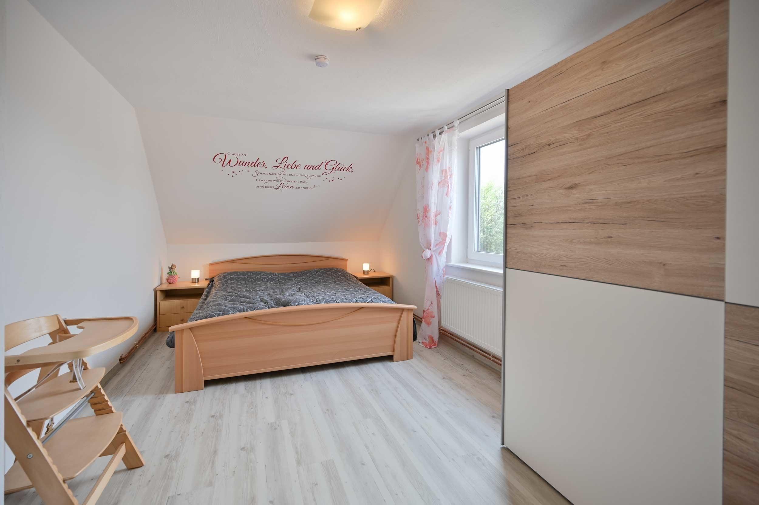 Das große Schlafzimmer besteht aus einem Doppelbett mit zwei Nachttischen und Kleiderschrank, dass zweite Schlafzimmer verfügt über zwei Einzelbetten mit Kleiderschrank. Sollte ein Kleinkind mitreisen, steht ein Kinderreisebett und ein Hochstuhl bereit. Das Badezimmer verfügt über ein Außenfenster zum Lüften und besteht aus einer Dusche mit Glastüren und einem WC.