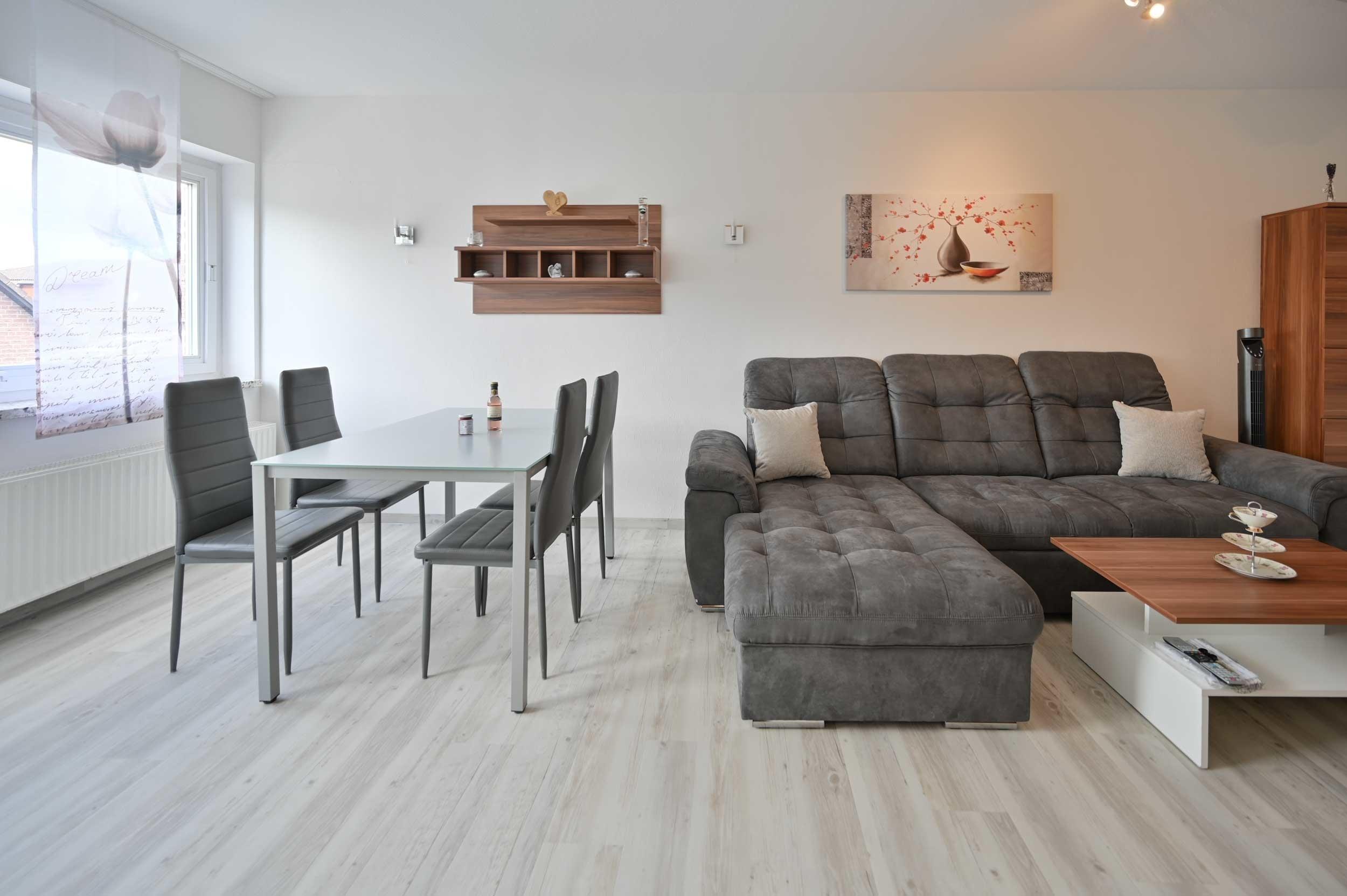 Die neue Küche verfügt über einen Backofen, ein Ceranfeld sowie eine Spülmaschine und einen Kaffeevollautomaten. Ebenfalls befindet sich im Wohnbereich ein Tisch mit 4 Stühlen, sowie einer Couch mit Schlaffunktion, Couchtisch, Flachbild-TV und Wohnwand. Von hieraus besteht die Möglichkeit auf den Balkonbereich mit Gartenmöbeln zu gelangen.