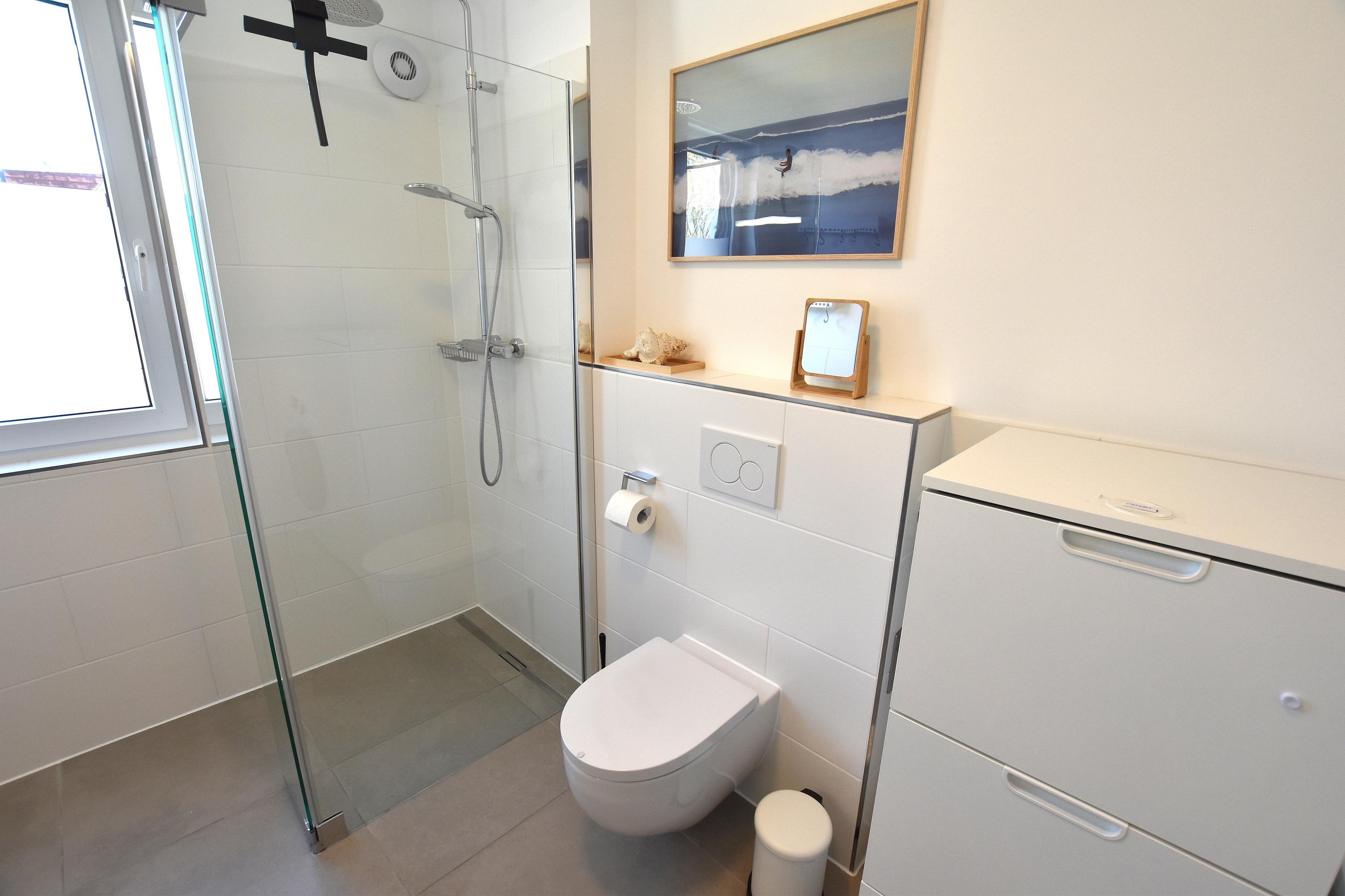 - Badezimmer mit bodentiefer Dusche, WC, Fenster, Waschbecken