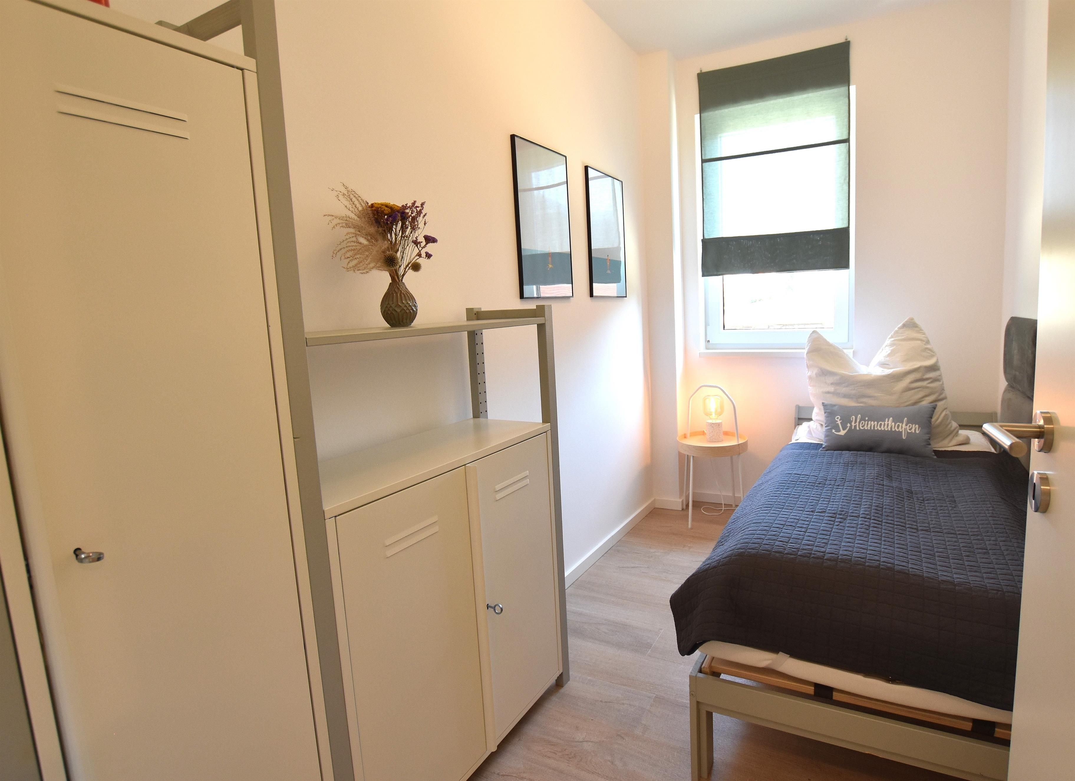 - ein kleines Schlafzimmer mit einem Einzelbett (90x200 cm), Nachttisch