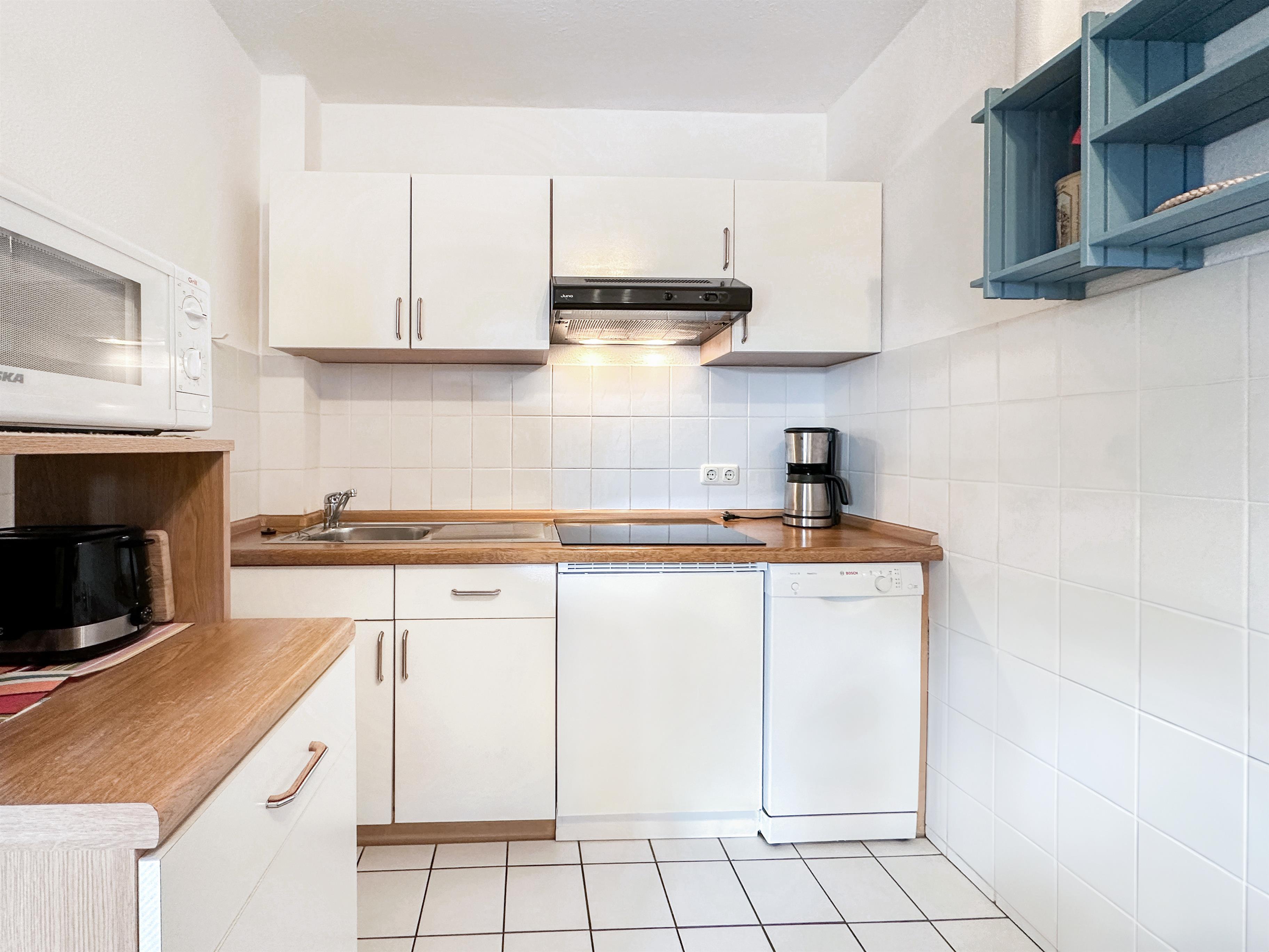 Flur, Duschbad, offene Küche mit Geschirrspüler, Mikrowelle und vielem mehr. Wohn-/Esszimmer mit Schlafcouch (120 cm x 200 cm) Eßtresen mit Stühlen und direktem Zugang zur bestuhlten Terrasse, ein seperatem Schlafzimmer mit Doppelbett (2 x 90 cm x 200 cm) und einem Etagenbett (70 cm x 190 cm)