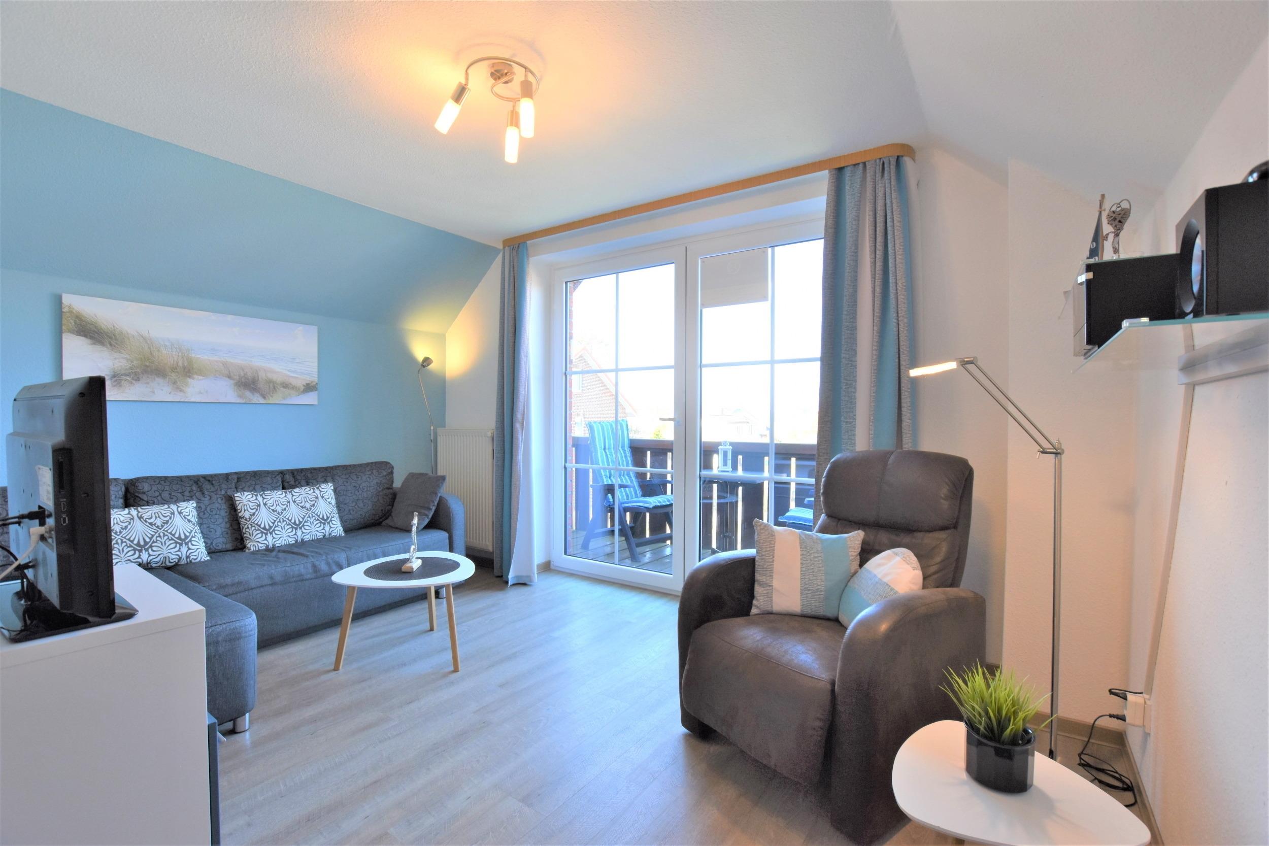 Der Dielenbereich ist ausgestattet mit einer Garderobe. Zudem verfügt die gemütliche Ferienwohnung über ein Bad mit Dusche und WC sowie einen möblierten Balkon.