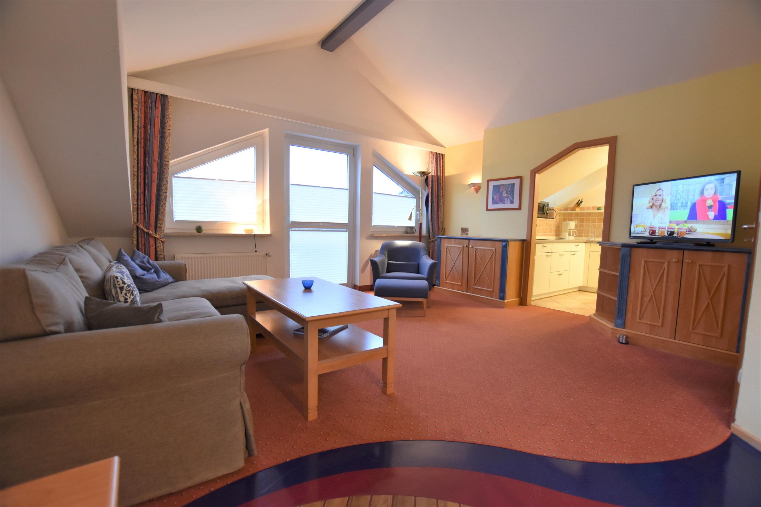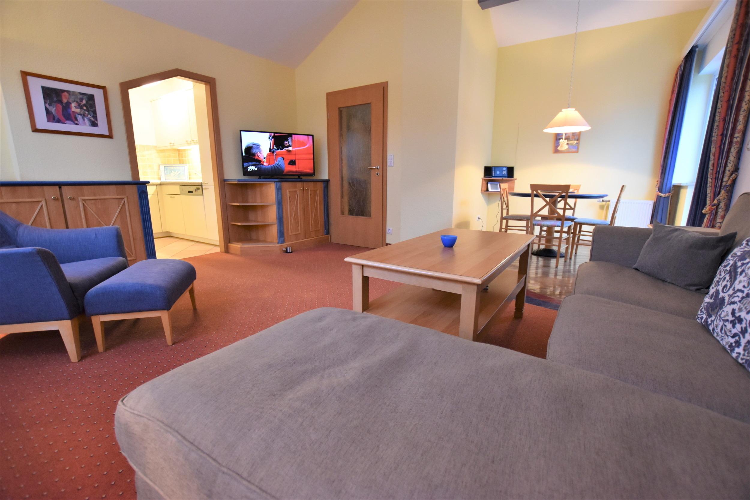 Es erwartet Sie eine drei Zimmerwohnung auf ca.68 m² für max. 4 Erw. + ein Kleinkind. ein großer Eingangsbereich mit Garderobe, ein geschmackvoll eingerichteter Wohnraum mit Sofabereich, Flachbild-TV, Esstisch und direktem Zugang zum bestuhlten Balkon. eine separater Küche mit Geschirrspüler, Ceranfeld und Mikrowelle. Schlafraum (1) mit Doppelbett (2x90x200), Kleiderschrank, Nachtisch und Nachtischlampe. Schlafraum (2) mit zwei Einzelbetten (90x200), Kleiderschrank, Nachtisch, Nachtischlampe. sowie einem Duschbad mit Dusche, Waschbecken, Spiegelschrank und WC. WLAN steht Ihnen kostenfrei zur Verfügung.