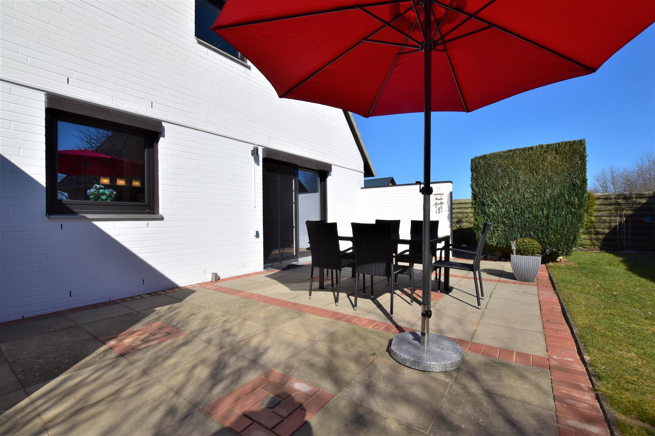 Eine offen Küche mit Spühlmaschine, Kühlschrank mit Eisfach, Kaffeemaschine, Mikrowelle, Esstisch für 6 Personen und einer gemütlichen Wohnlandschafft, TV, CD Player, Radio und direktem Zugang zum eingezäunten Garten mit bestuhlter Terrasse mit Grill.