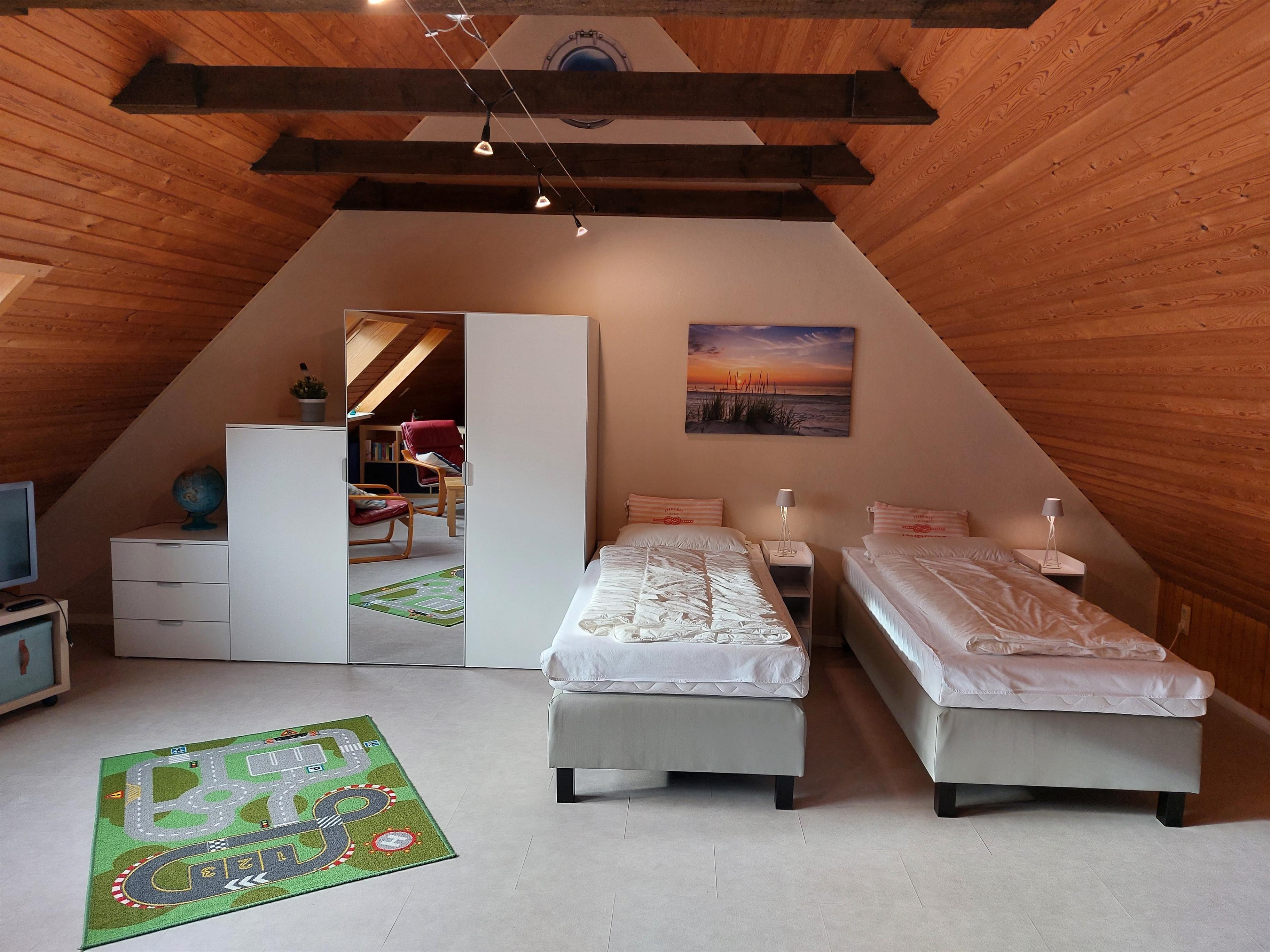 1 Studio mit 2 Einzelbetten(2x90x200cm), Kleiderschrank und Nachttisch. Außerdem befindet sich im Obergeschoss ein 2 Tv, ein Billardtisch und großem Spiel Bereich