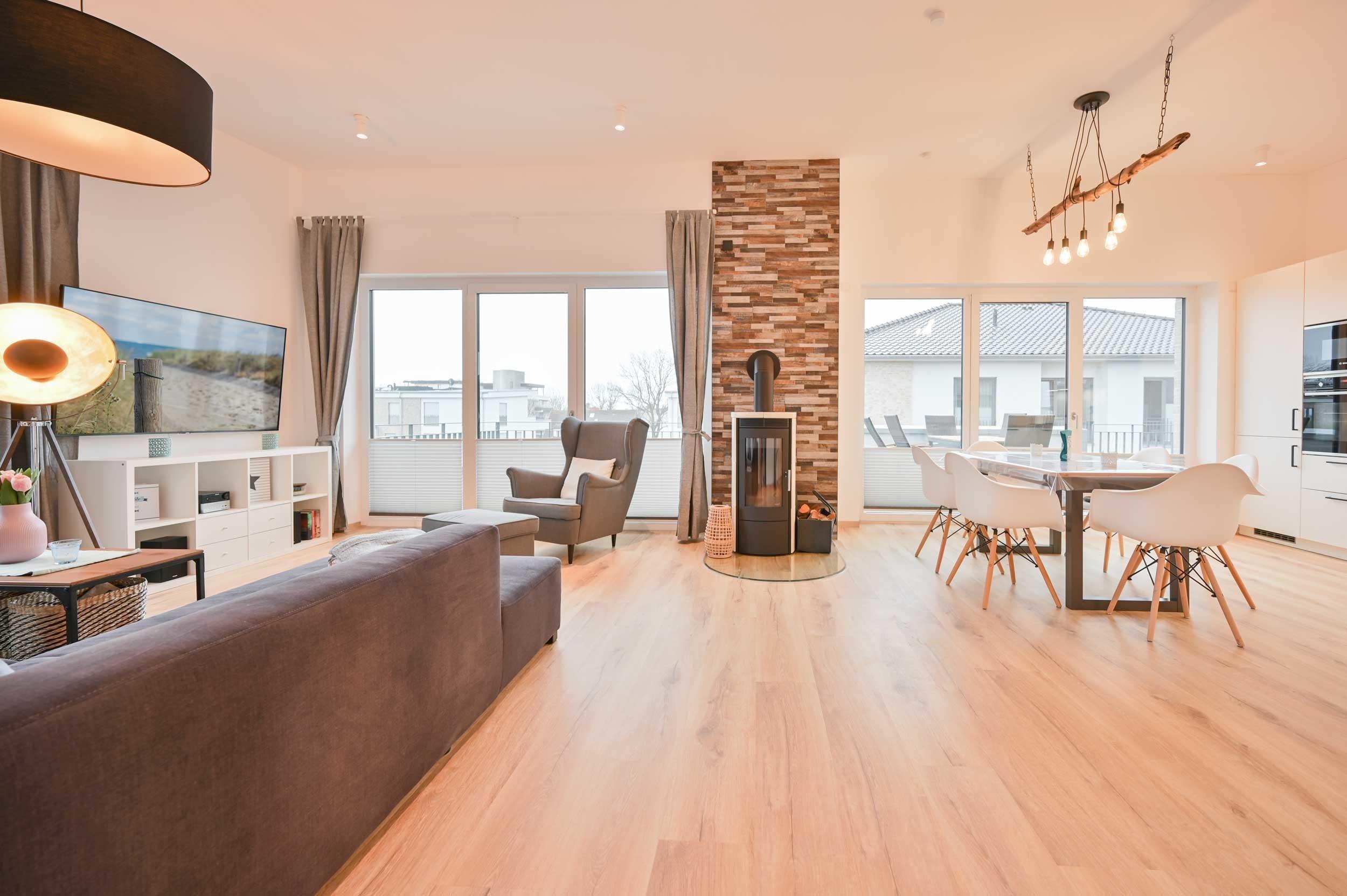 Moderne Ferienwohnung in Dahme mit Dachterrasse, Ostseeblick und Kamin für erholsamen Urlaub.