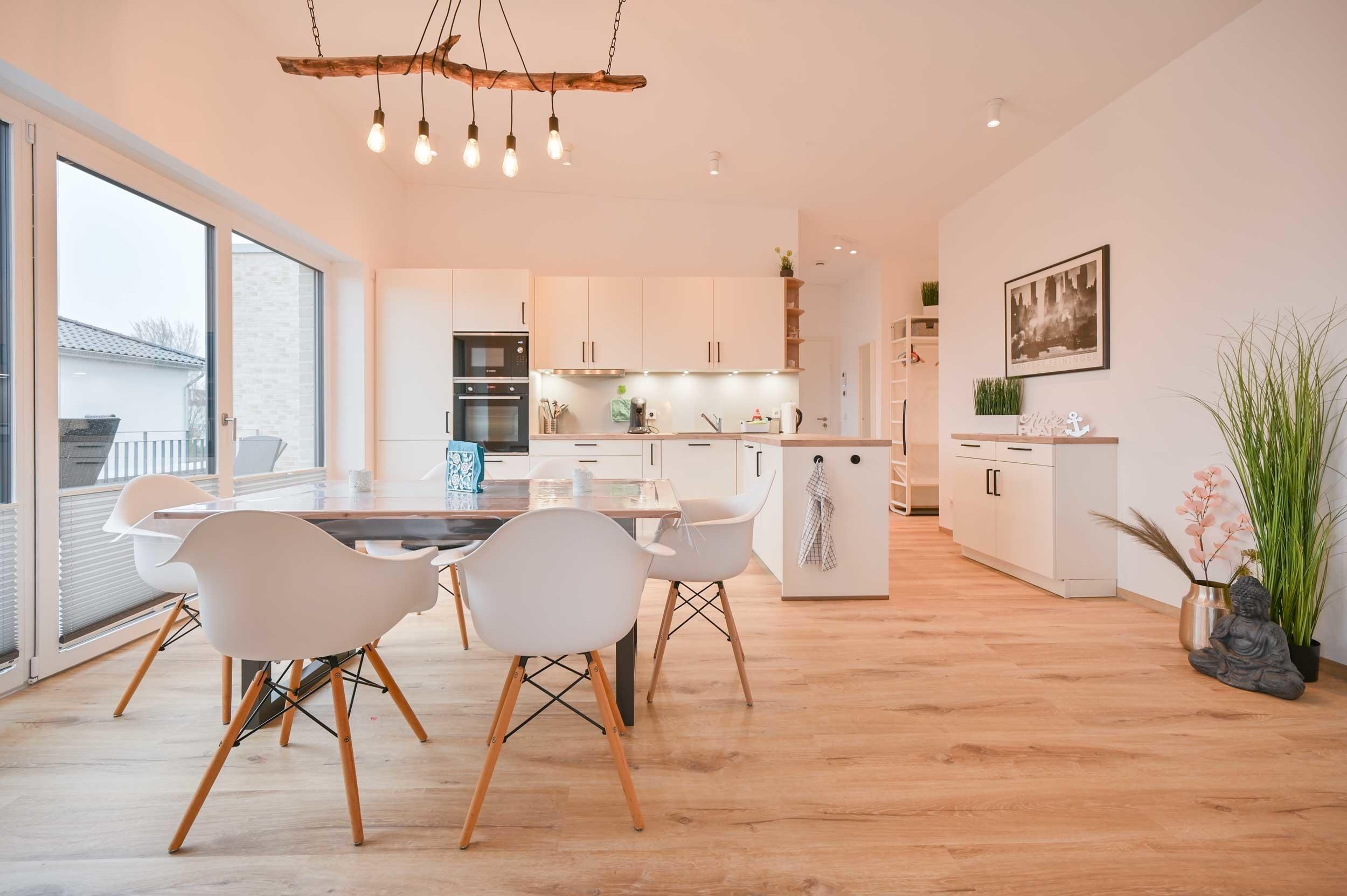 Im großen Wohn-Essbereich finden Sie eine gut ausgestattete Einbauküche vor, ein Essbereich für 6 Personen (erweiterbar auf 7), ein gemütliches Sofa mit Schlaffunktion, Ein Couchtisch sowie TV-Möbel mit großem SMART-TV.