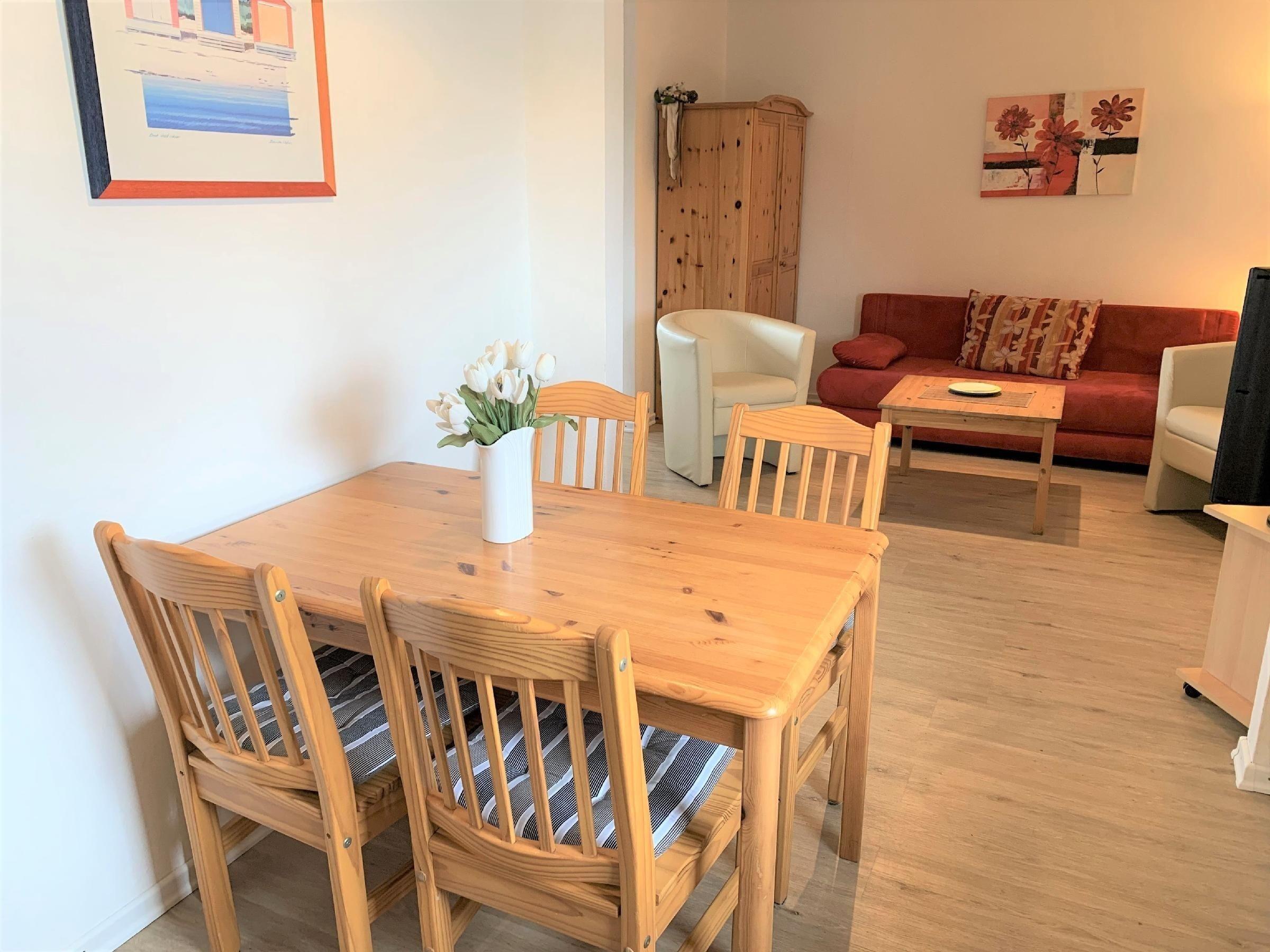 Die komfortable 2- Raum Wohnung mit Balkon ist für bis zu 4 Erwachsene + 1 Kleinstkind geeignet. Die freundlich ausgestattete Wohnung befindet sich im 1. Stock des Hauses und verfügt über ein separates Schlafzimmer mit 2 Einzelbetten, ein Wohnzimmer mit offener integrierter Küche, Schlafsofa für 2 Personen (140x200cm), Sessel sowie Couchtisch. Am Küchentisch mit Bestuhlung finden Sie ausreichend Platz zum gemeinsamen Essen. Das separate Tageslichtbadezimmer ist mit Dusche, WC und Waschbecken ausgestattet.