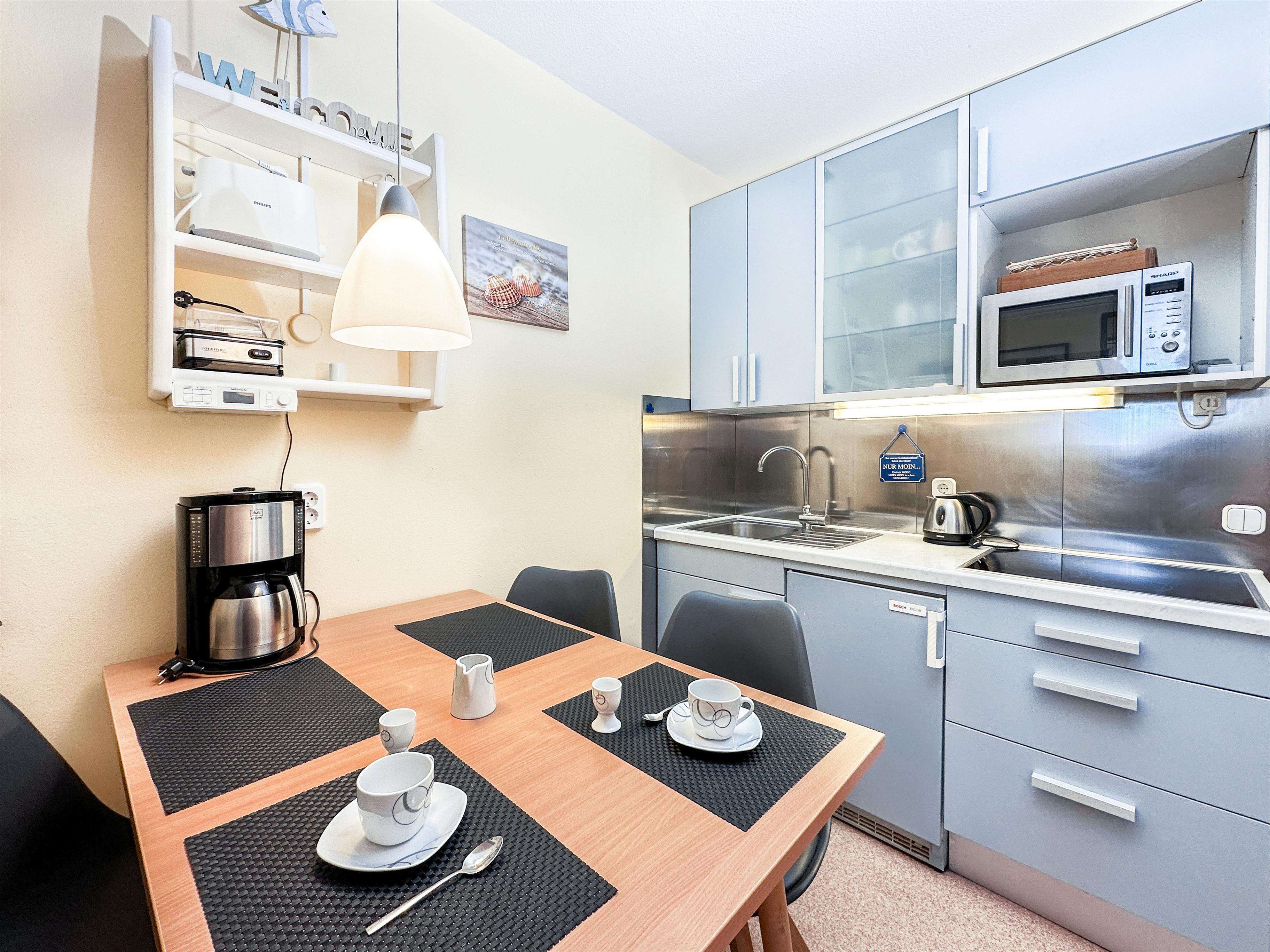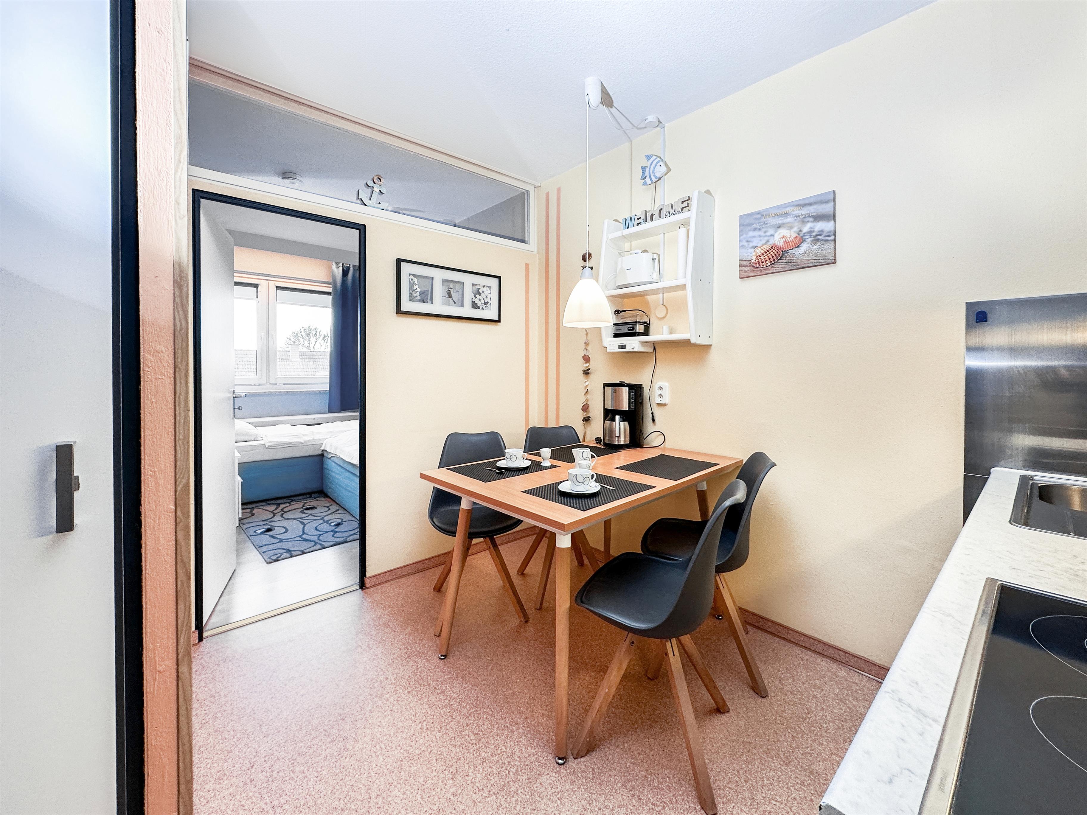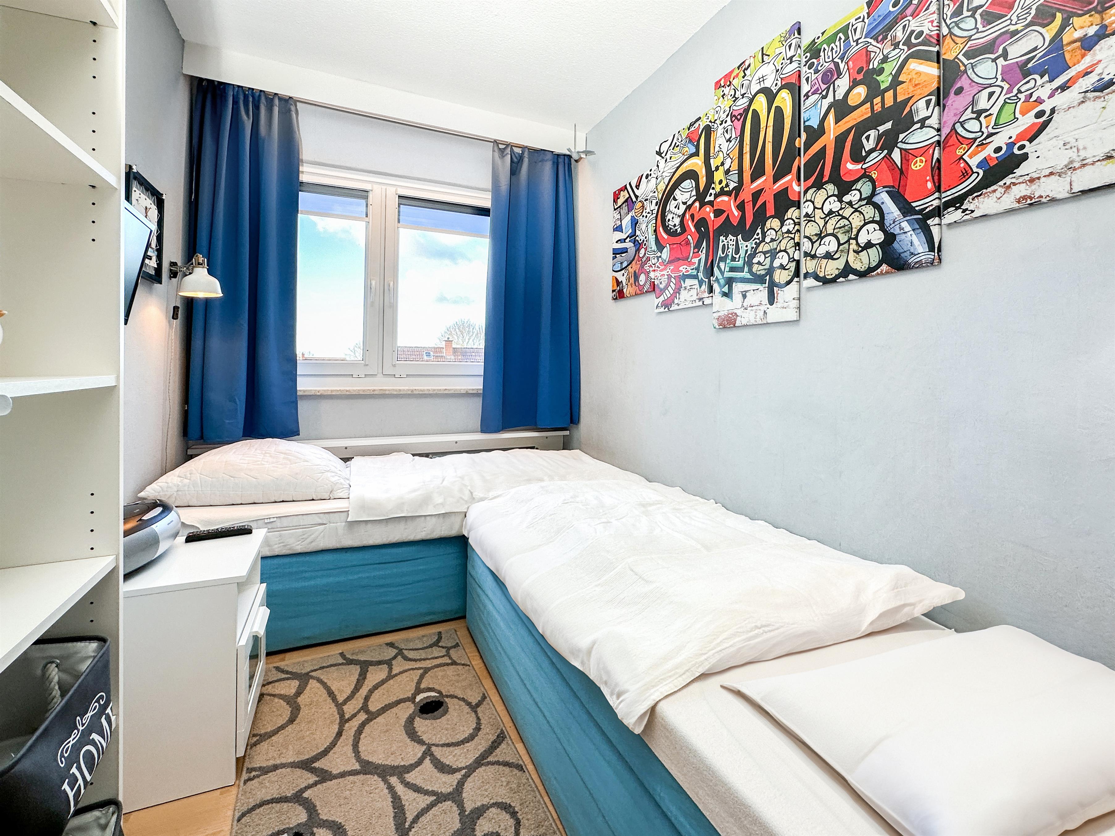 Der kombinierte Wohn- und Schlafraum erwartet Sie mit einem komfortablen Doppelbett (2x80x200), einem gemütlichen Ecksofa sowie einem Flachbildfernseher. Der Wohnbereich ist durch die großen Fenster stets hell und lichtdurchflutet. Vom Wohnbereich aus gelangen Sie auf den Balkon. An der Tür wurde ein Insektenschutz angebracht, um Sie vor unerwünschten, kleinen Besuchern (Insekten) in der Wohnung zu schützen. Des Weiteren ist ein separater Schlafraum mit zwei Einzelbetten (80x200) und einem weiteren Flachbildfernseher, sowie eine komplett ausgestattete Küche vorhanden. Auf dem nach Westen ausgerichteten, möblierten Balkon können Sie den Sonnenuntergang genießen. Der WLAN-Anschluss ist selbstverständlich inklusive.