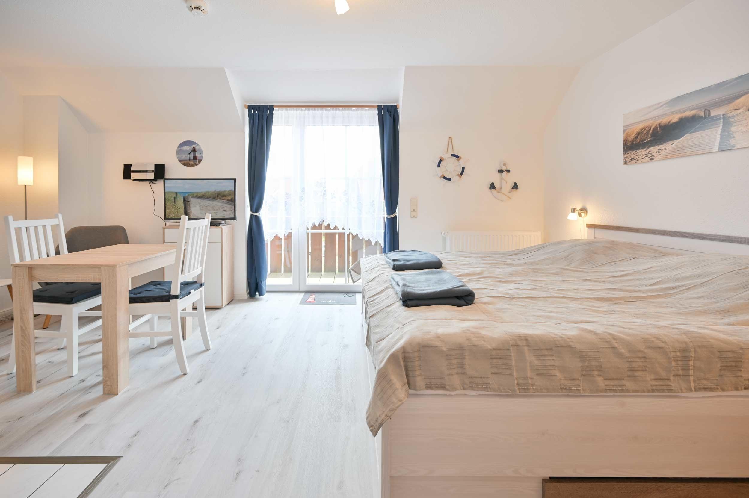 Die gemütliche Ferienwohnung im Ostseebad Dahme liegt im 1. Obergeschoss am Ende einer Sackgasse und verfügt über ein Wohnschlafzimmer mit integrierter Küchenzeile, Kleiderschrank, Kommode, Tisch mit 2 Stühlen und zusätzlichem Klappstuhl, Doppelbett (180x200) mit Nachttischen und Zugang zum Balkon. Außerdem verfügt die Ferienwohnung über ein Bad mit Dusche und WC. Im Flur finden Gäste einen Dielenschrank und eine Garderobe.