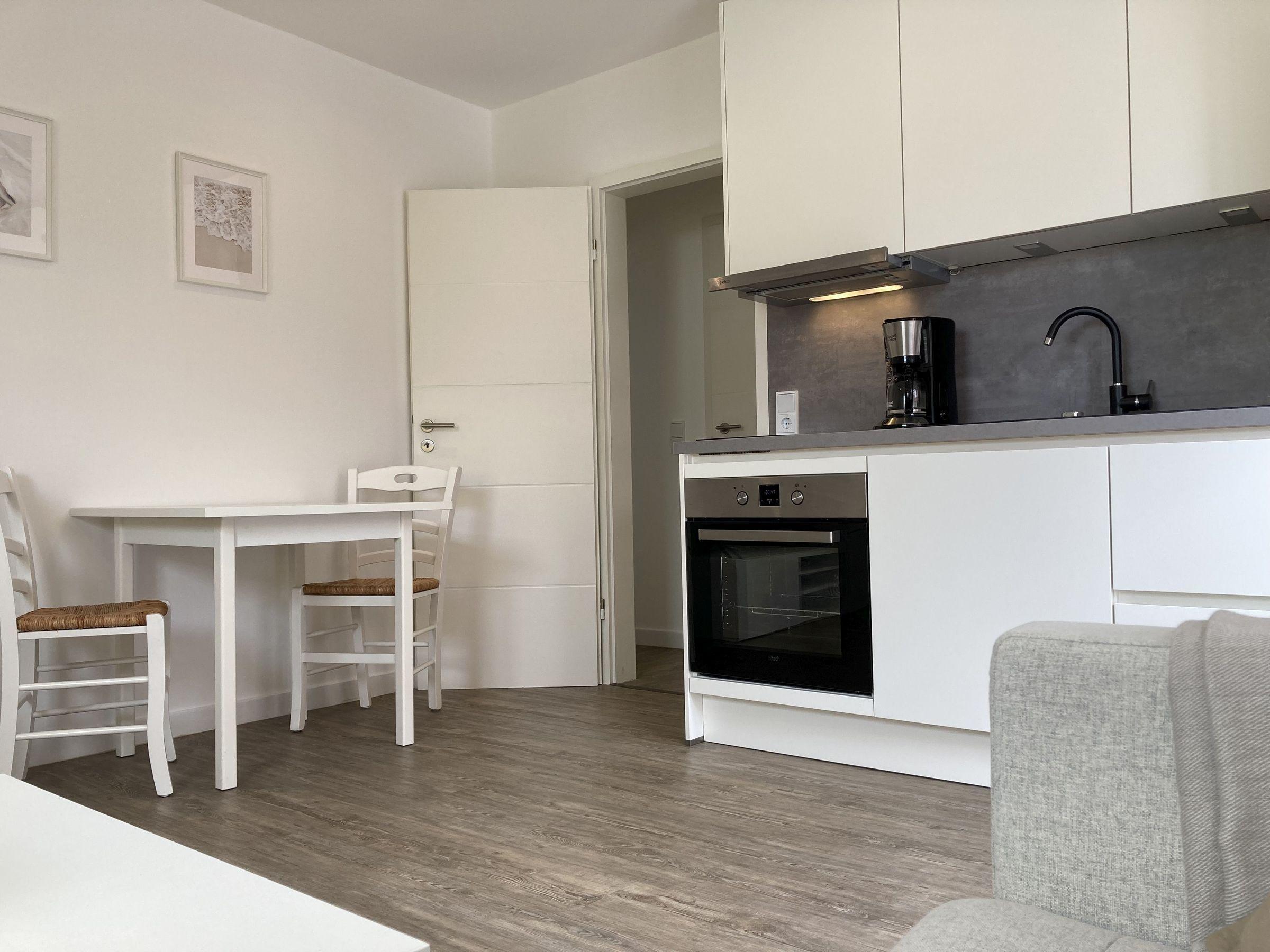 Ihr Appartement hat einen Wohnraum mit integrierter Küchenzeile, Essbereich und